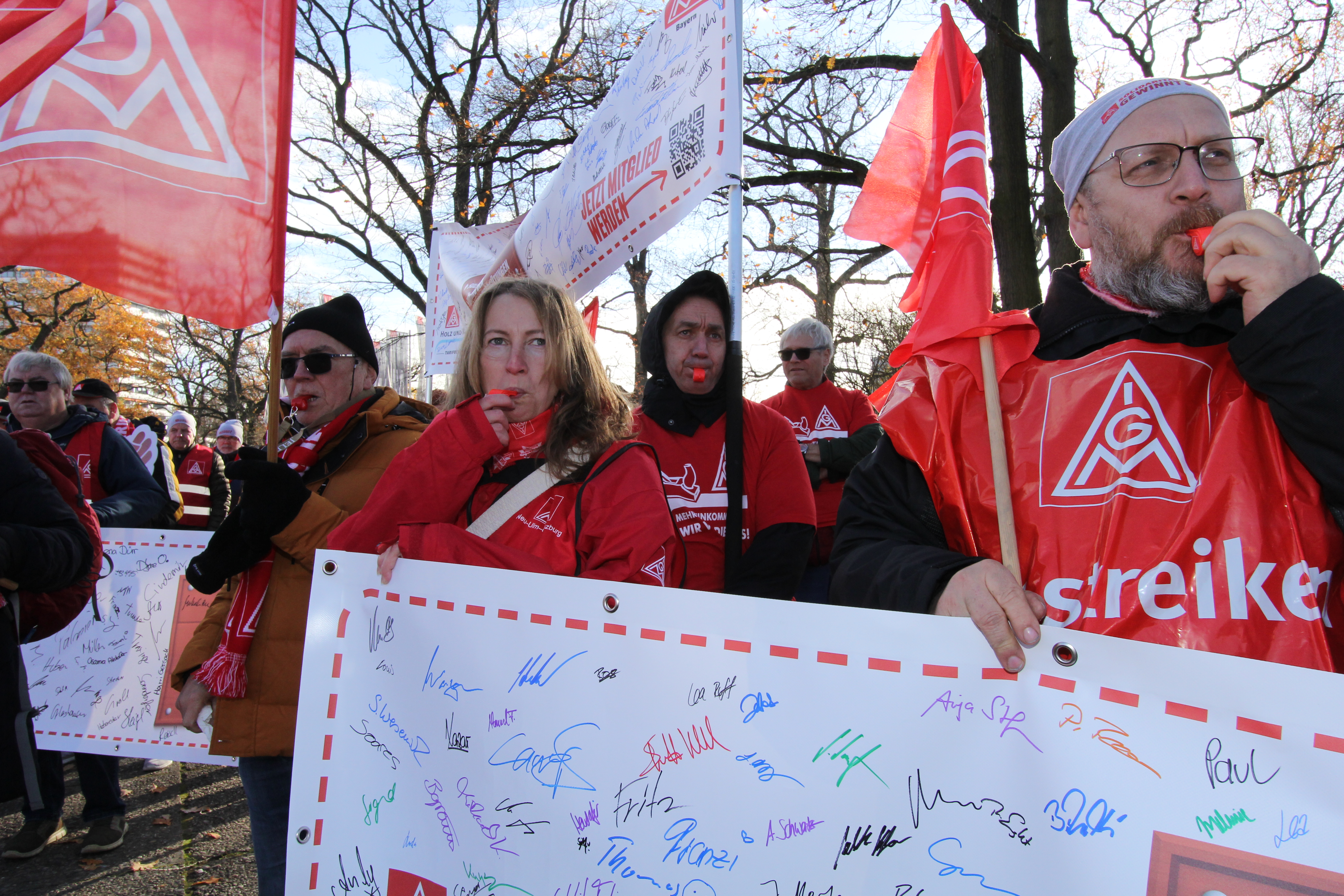 Um ihren Forderungen Nachdruck zu verleihen, brachten die Betriebsräte der beteiligten Betriebe den Arbeitgebern Riesenbanner mit, auf denen die Belegschaften für die Tarifforderung der IG Metall unterschrieben haben.