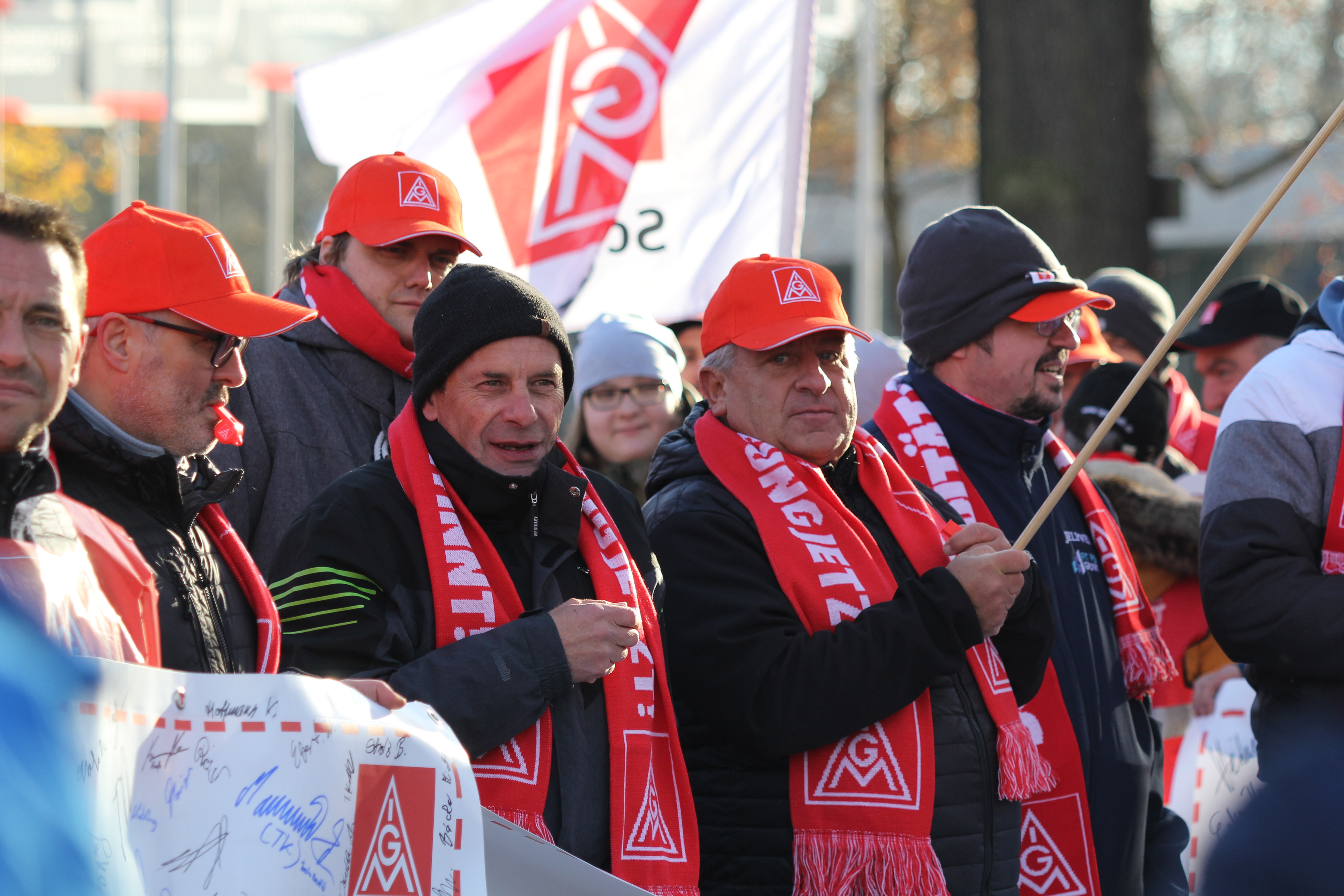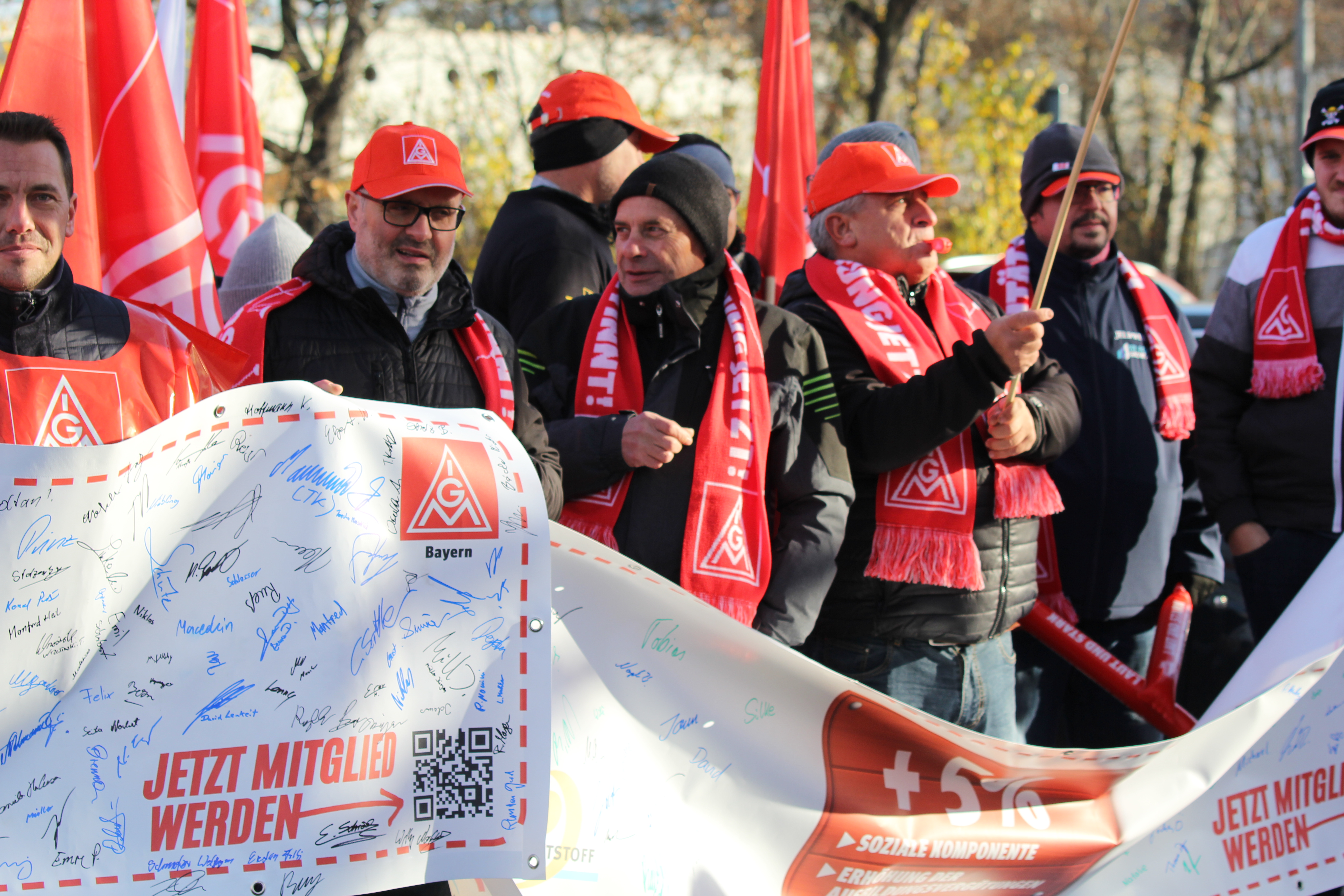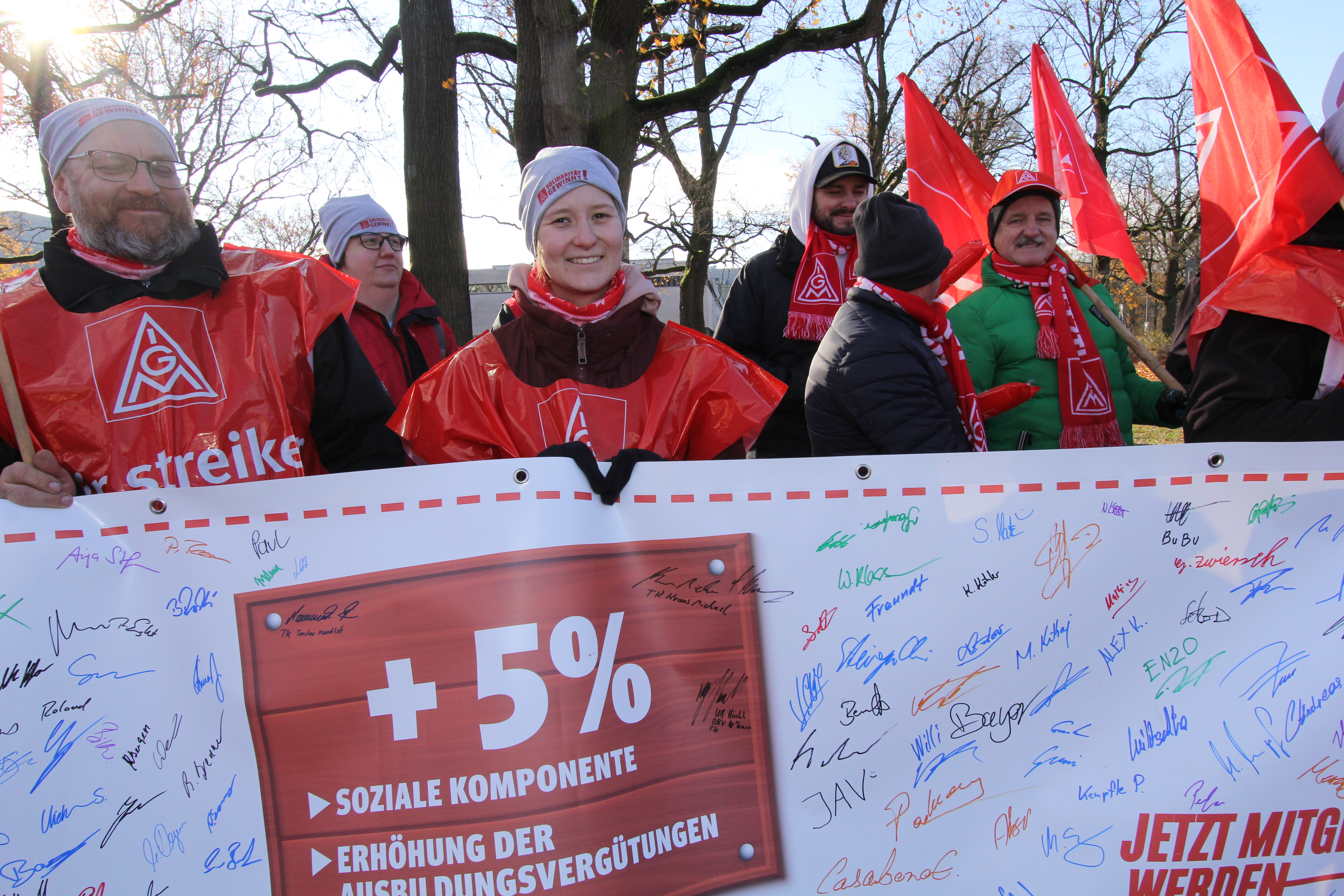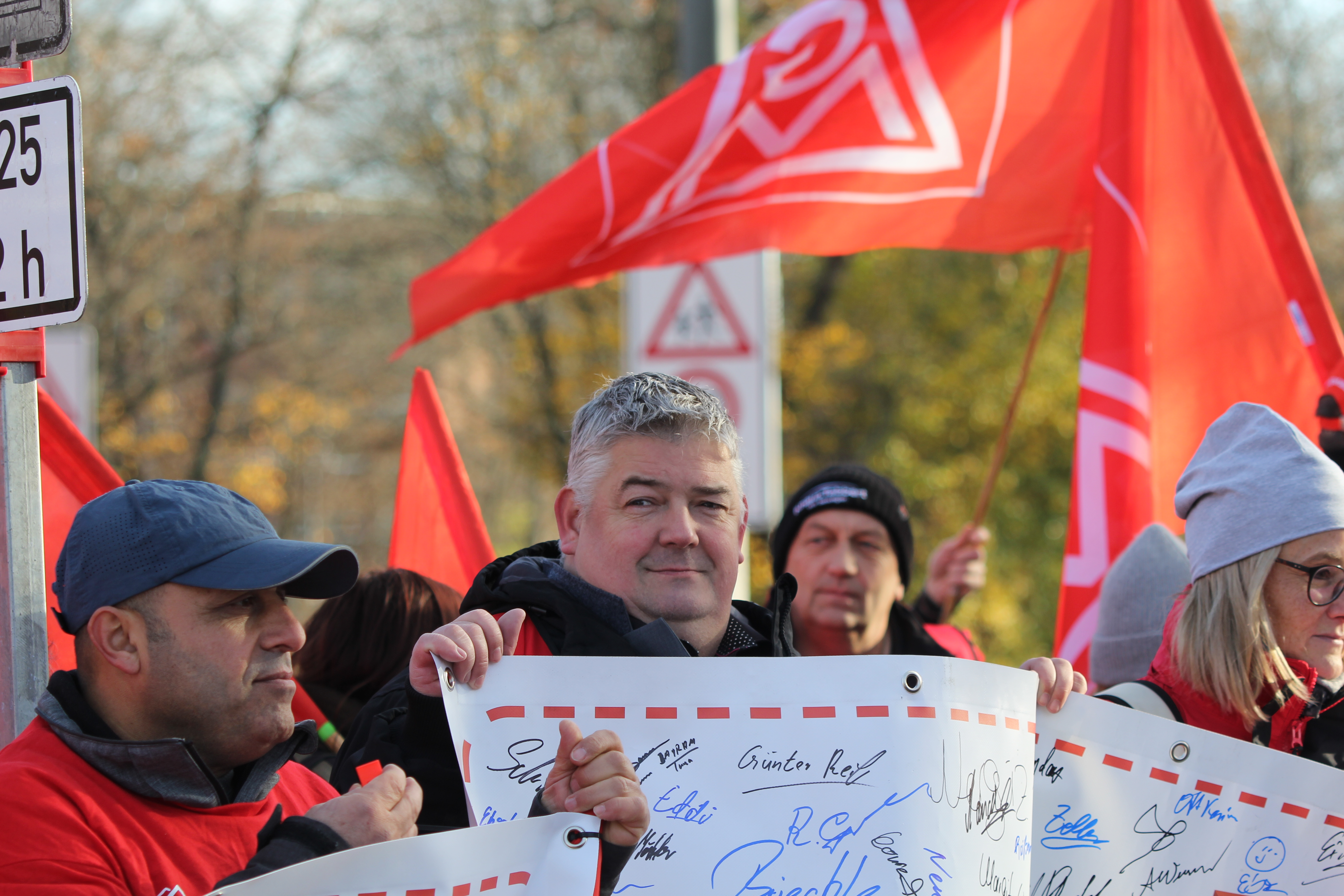 Um ihren Forderungen Nachdruck zu verleihen, brachten die Betriebsräte der beteiligten Betriebe den Arbeitgebern Riesenbanner mit, auf denen die Belegschaften für die Tarifforderung der IG Metall unterschrieben haben.