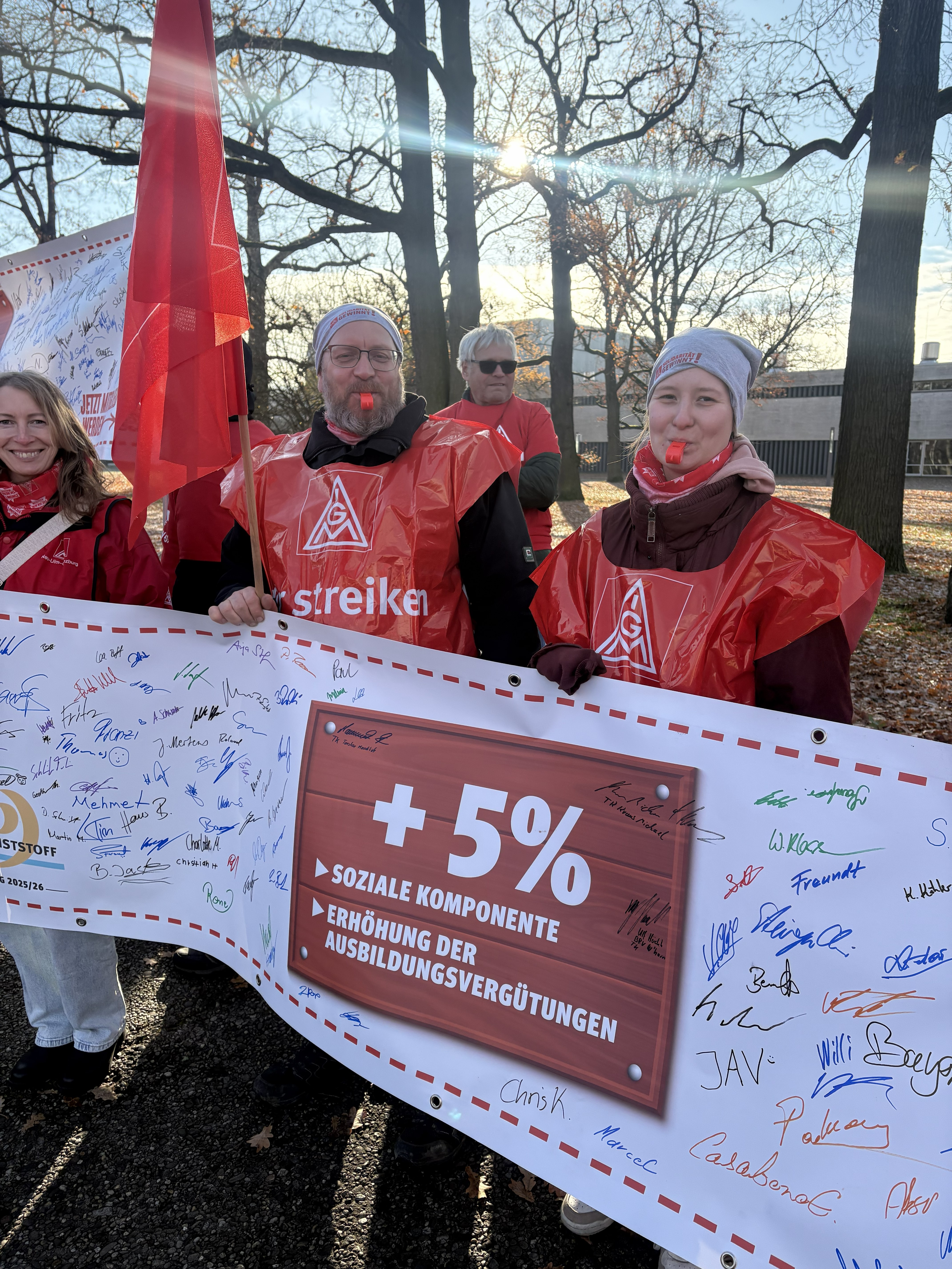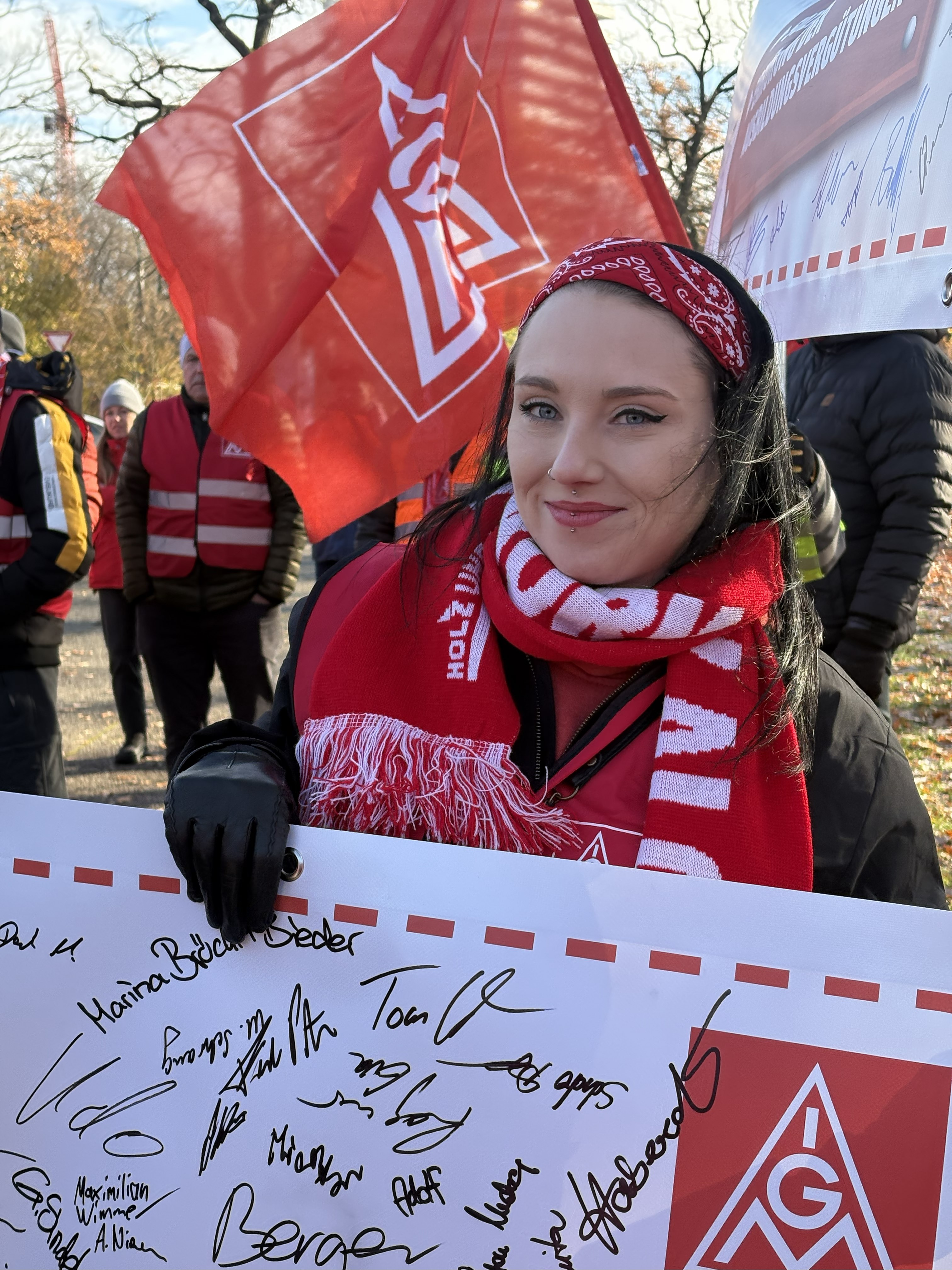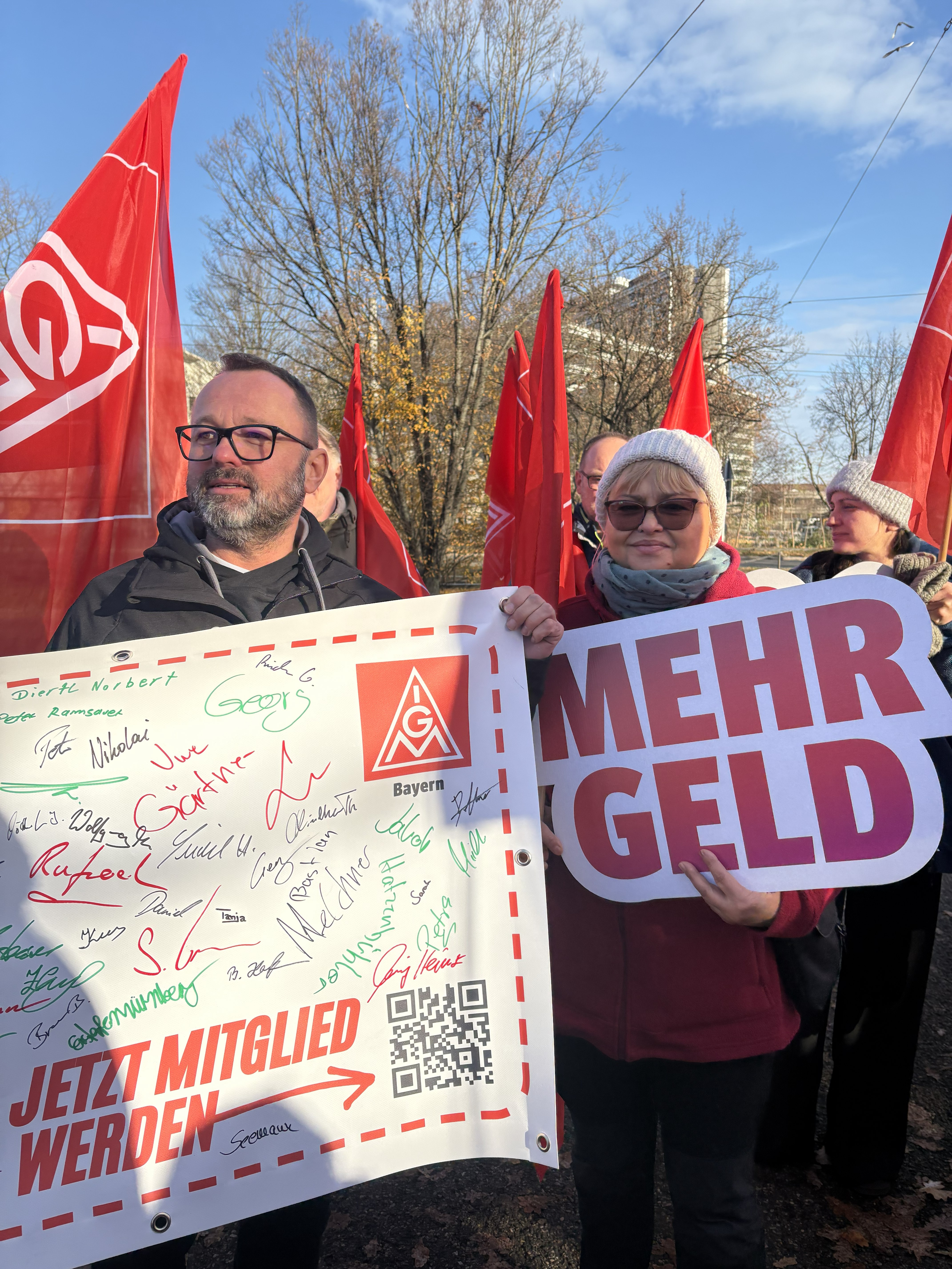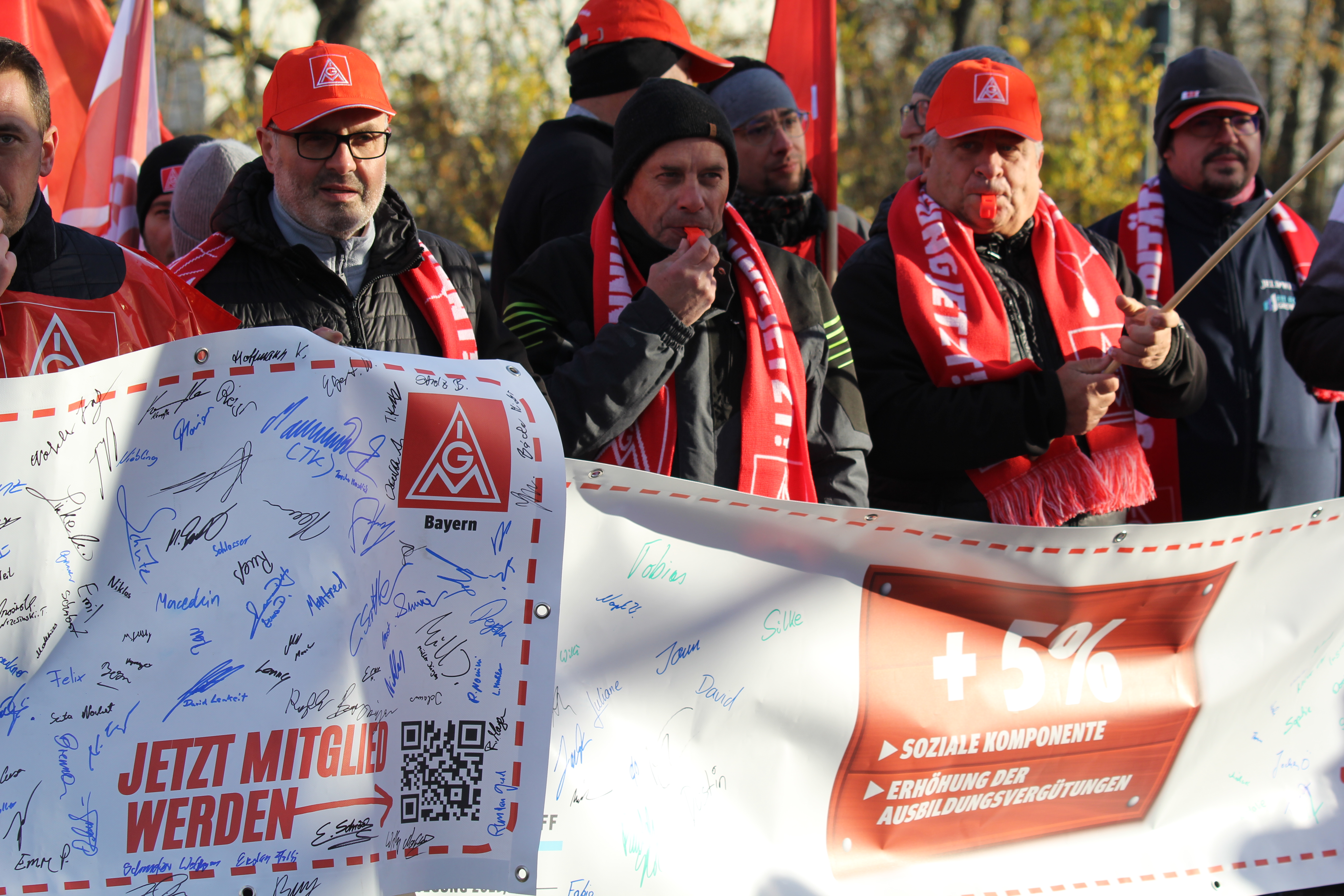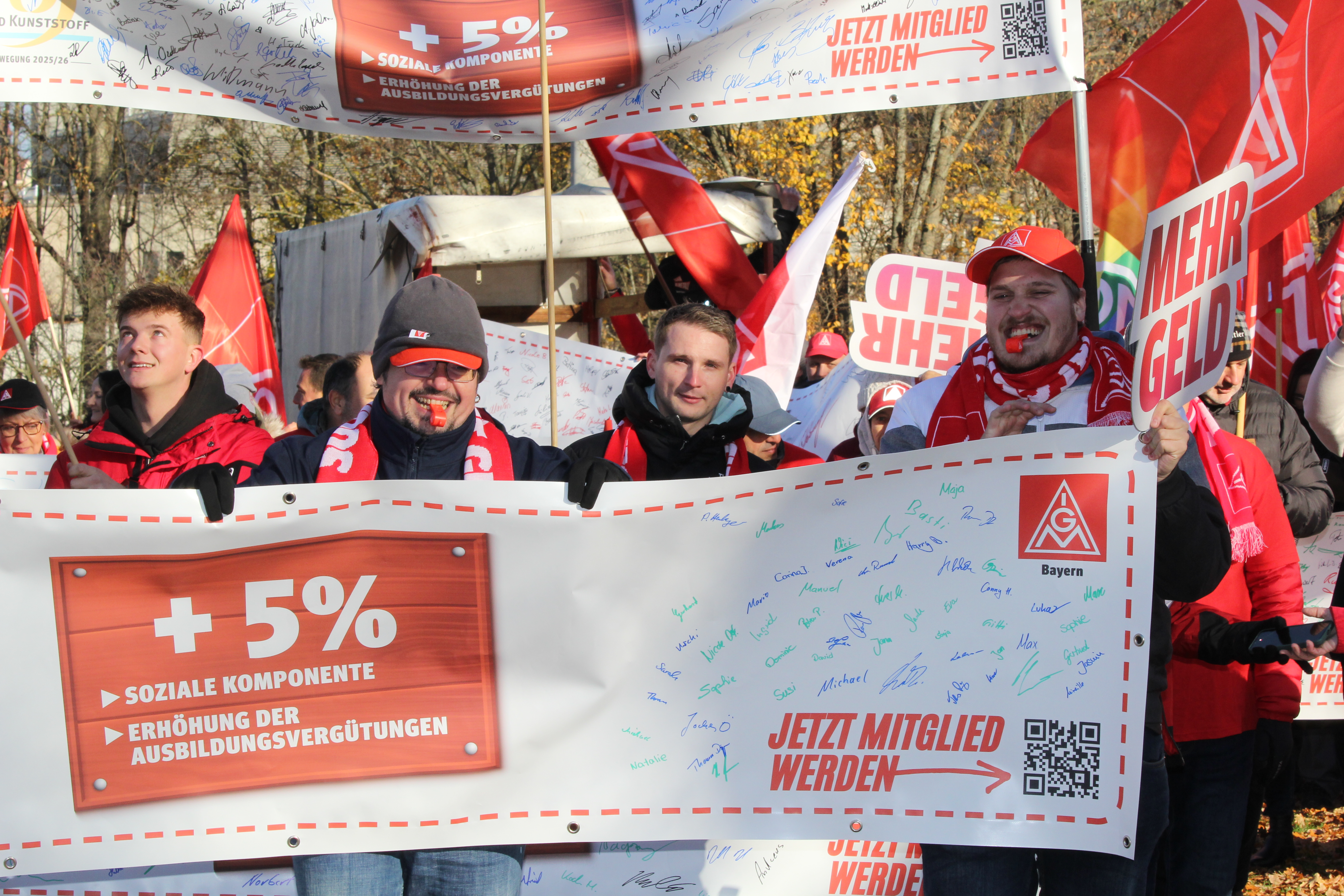 Um ihren Forderungen Nachdruck zu verleihen, brachten die Betriebsräte der beteiligten Betriebe den Arbeitgebern Riesenbanner mit, auf denen die Belegschaften für die Tarifforderung der IG Metall unterschrieben haben.