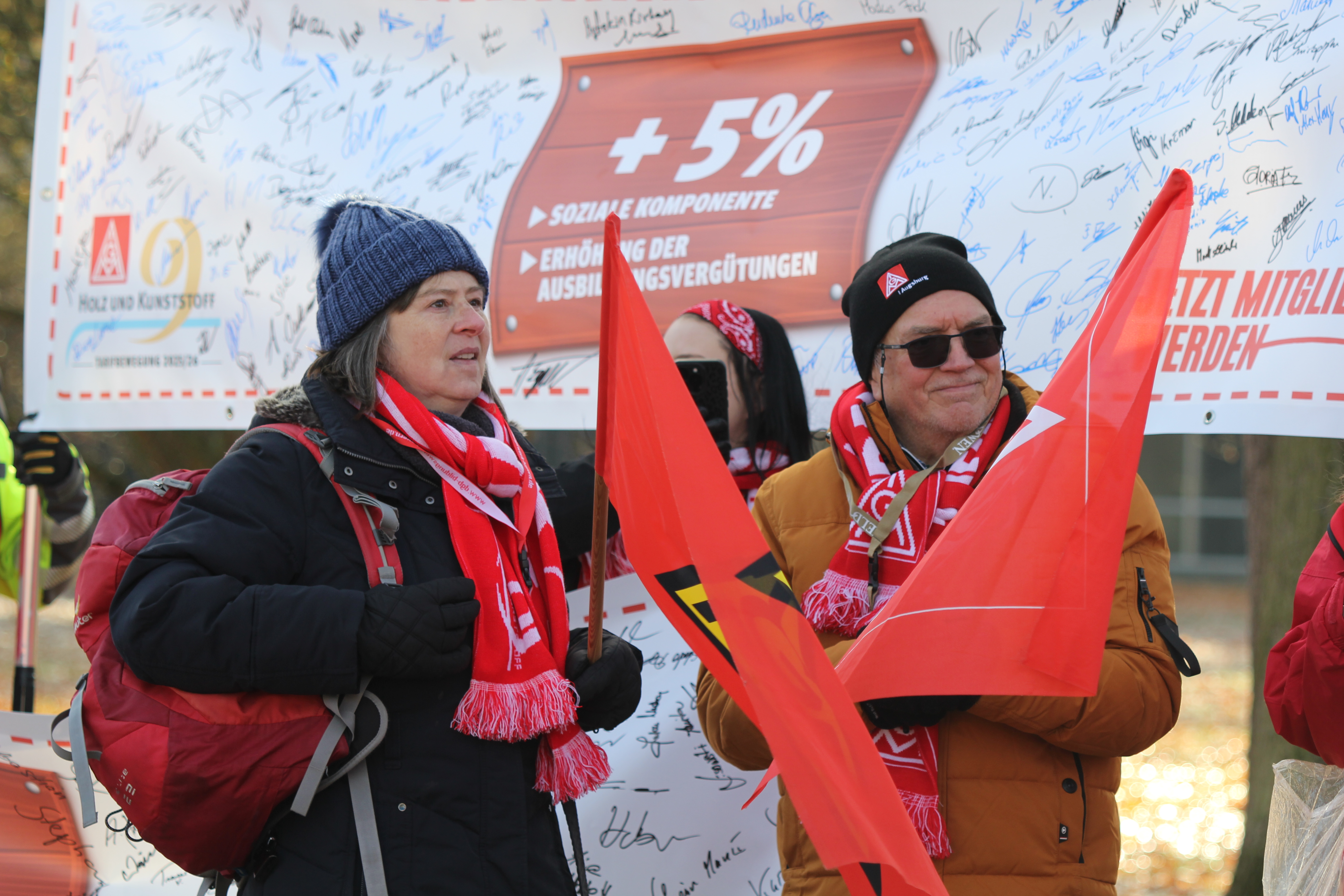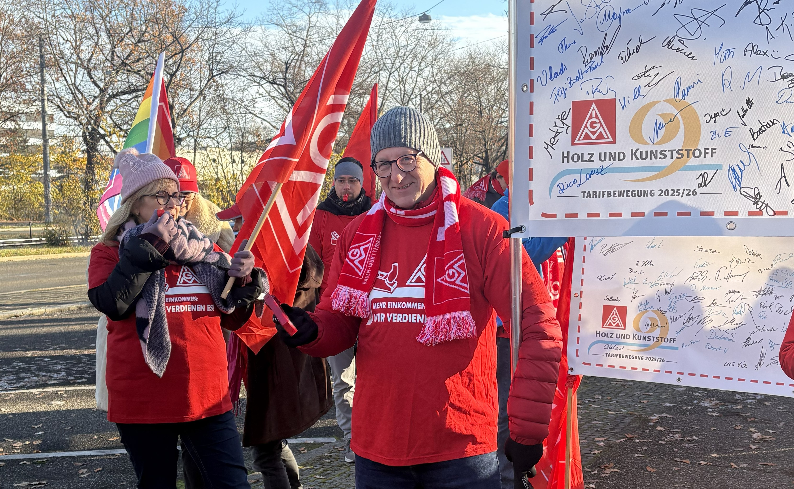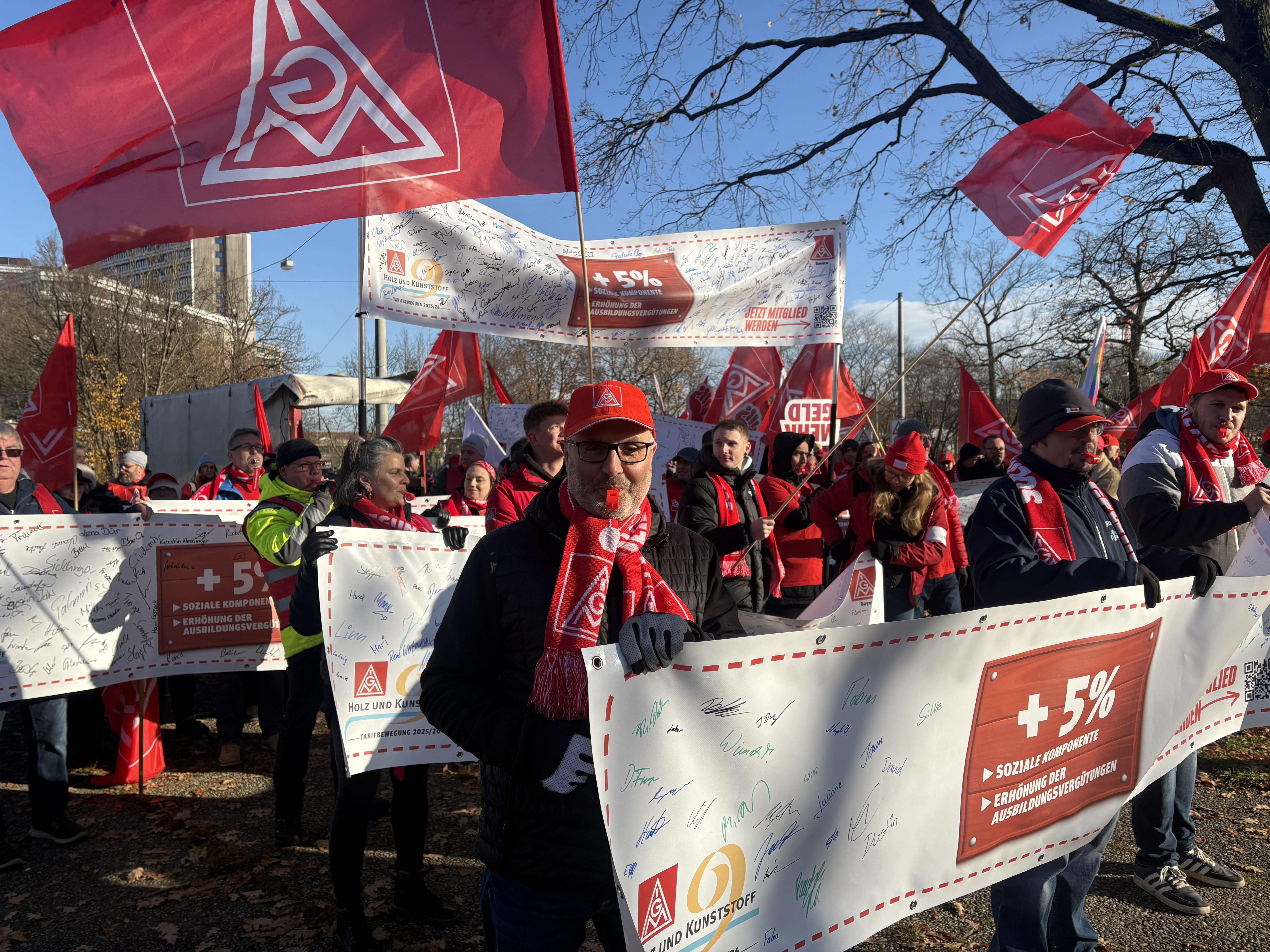 200 Beschäftigte aus elf Betrieben der bayerischen holz- und kunststoffverarbeitenden Industrie haben heute in Nürnberg mit einer Demonstration vor der ersten Tarifverhandlung Druck auf die Arbeitgeber gemacht. Die IG Metall Bayern fordert für die gut 10.000 tarifgebundenen Beschäftigten fünf Prozent mehr Geld, eine starke soziale Komponente für die unteren Entgeltgruppen und für die Auszubildenden eine überproportionale Erhöhung ihrer Vergütung bei einer Laufzeit von zwölf Monaten. Die Arbeitgeber haben heute in der konstruktiv geführten ersten Tarifverhandlung kein Angebot vorgelegt.