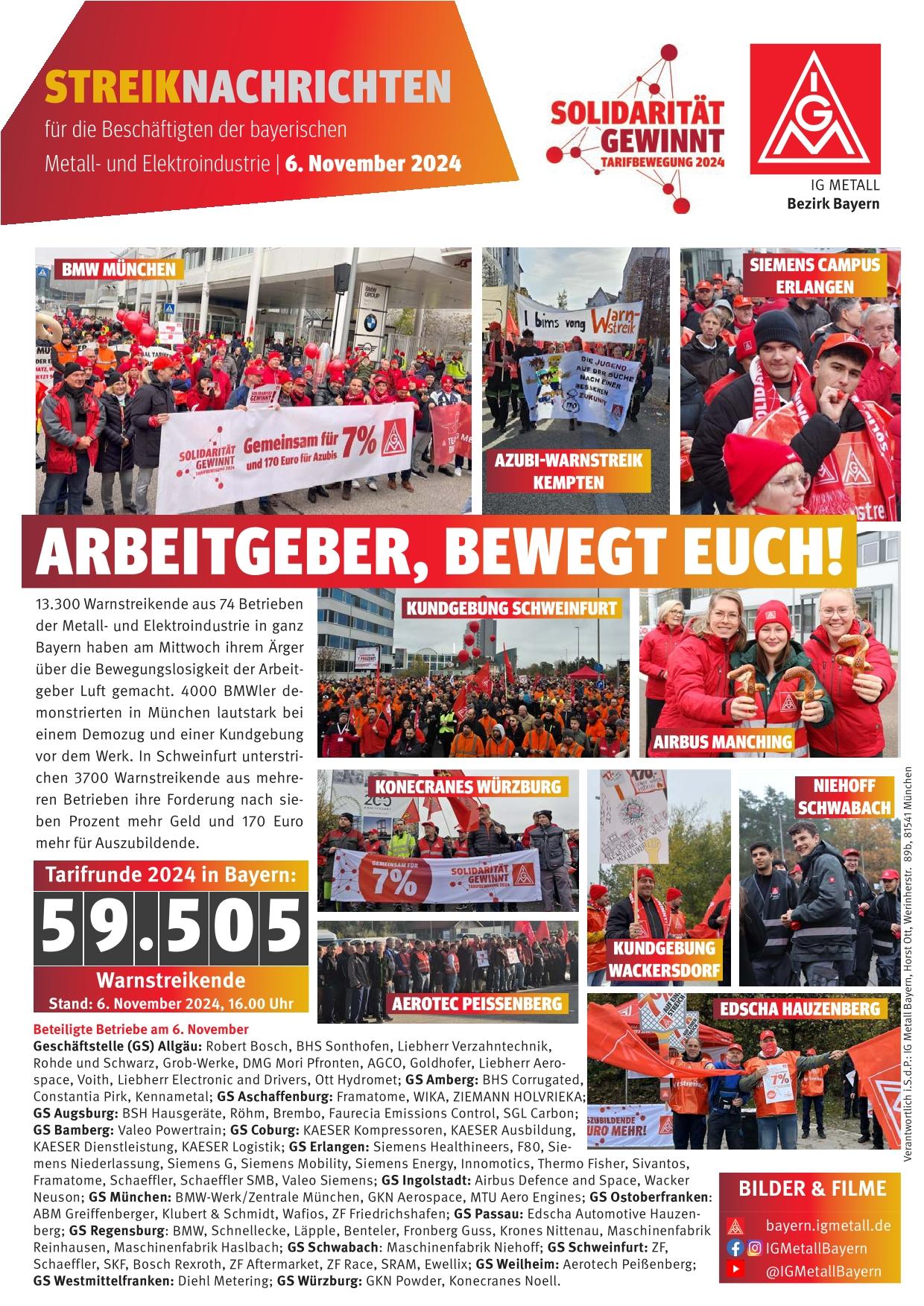 Weitere große Warnstreik-Kundgebungen fanden am Mittwoch bei Airbus in Manching mit 1100 Beschäftigten und in Wackersdorf mit 600 Beschäftigten aus fünf Betrieben statt. Auf dem Siemens-Campus in Erlangen versammelten sich 450 Warnstreikende vorwiegend aus Siemens-Betrieben zu einer gemeinsamen Kundgebung. Bei einem zentralen Azubi-Warnstreik in Kempten zogen 300 Auszubildende aus dem gesamten Allgäu farbenfroh durch die Stadt. In mehreren Betrieben sind bis zum Abend noch weitere Schichten zu Warnstreiks aufgerufen.
