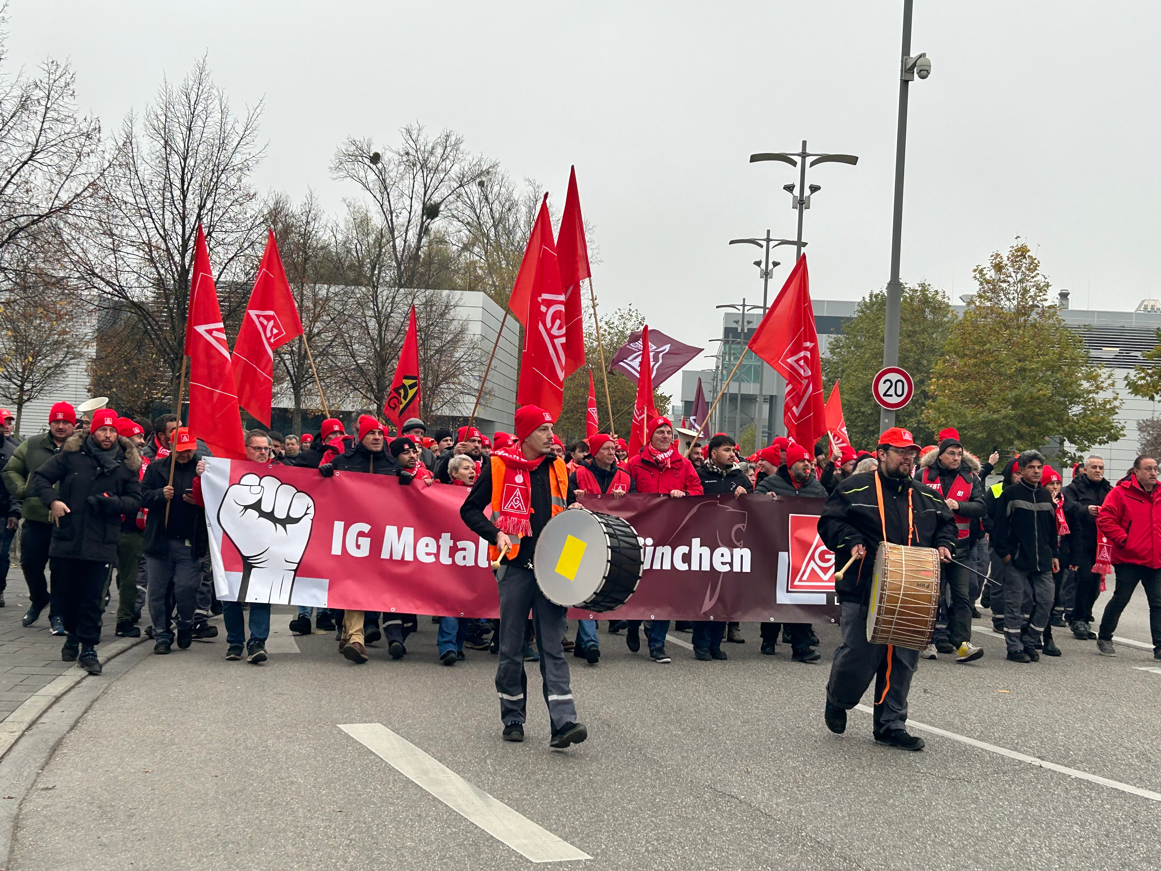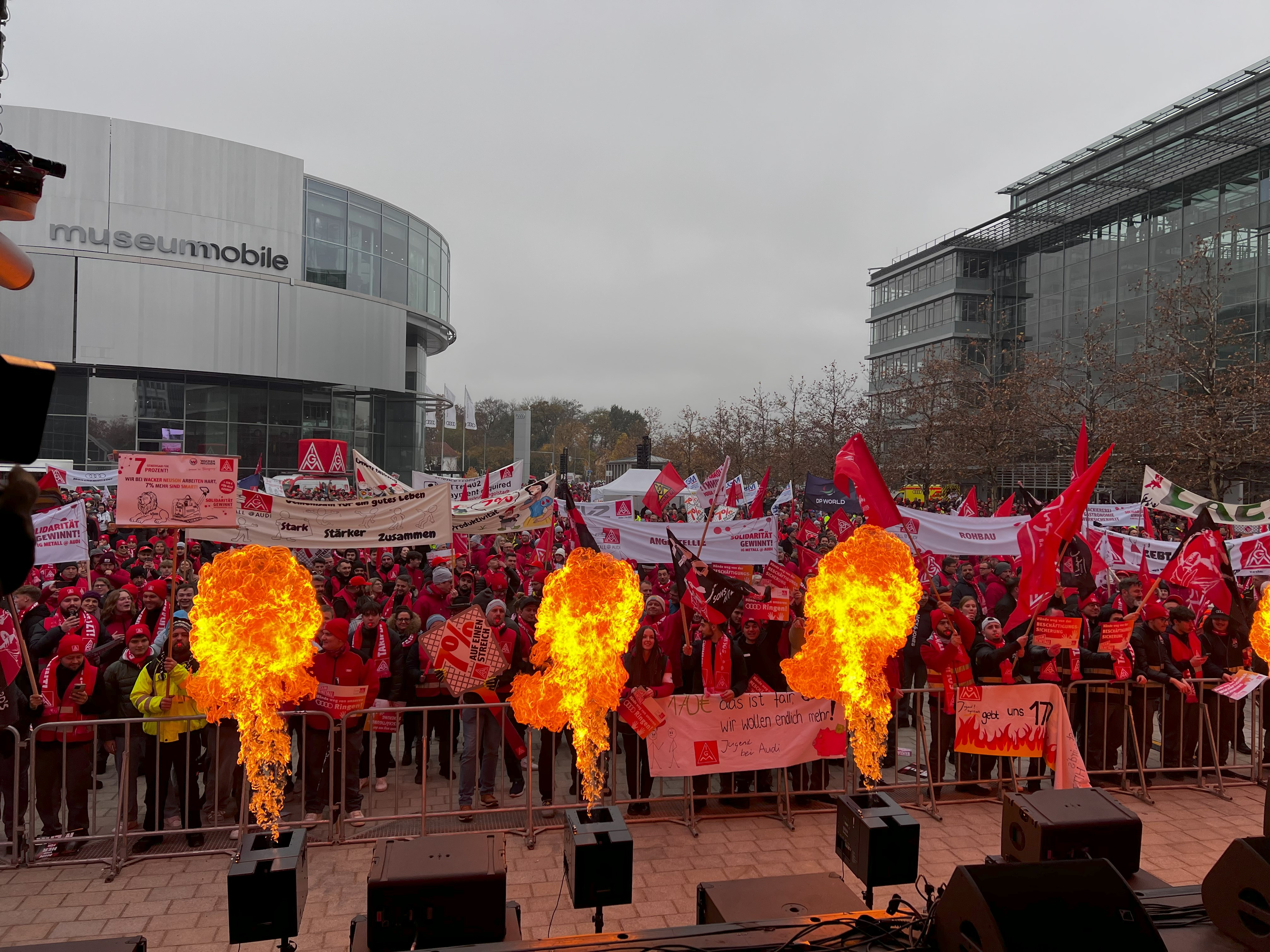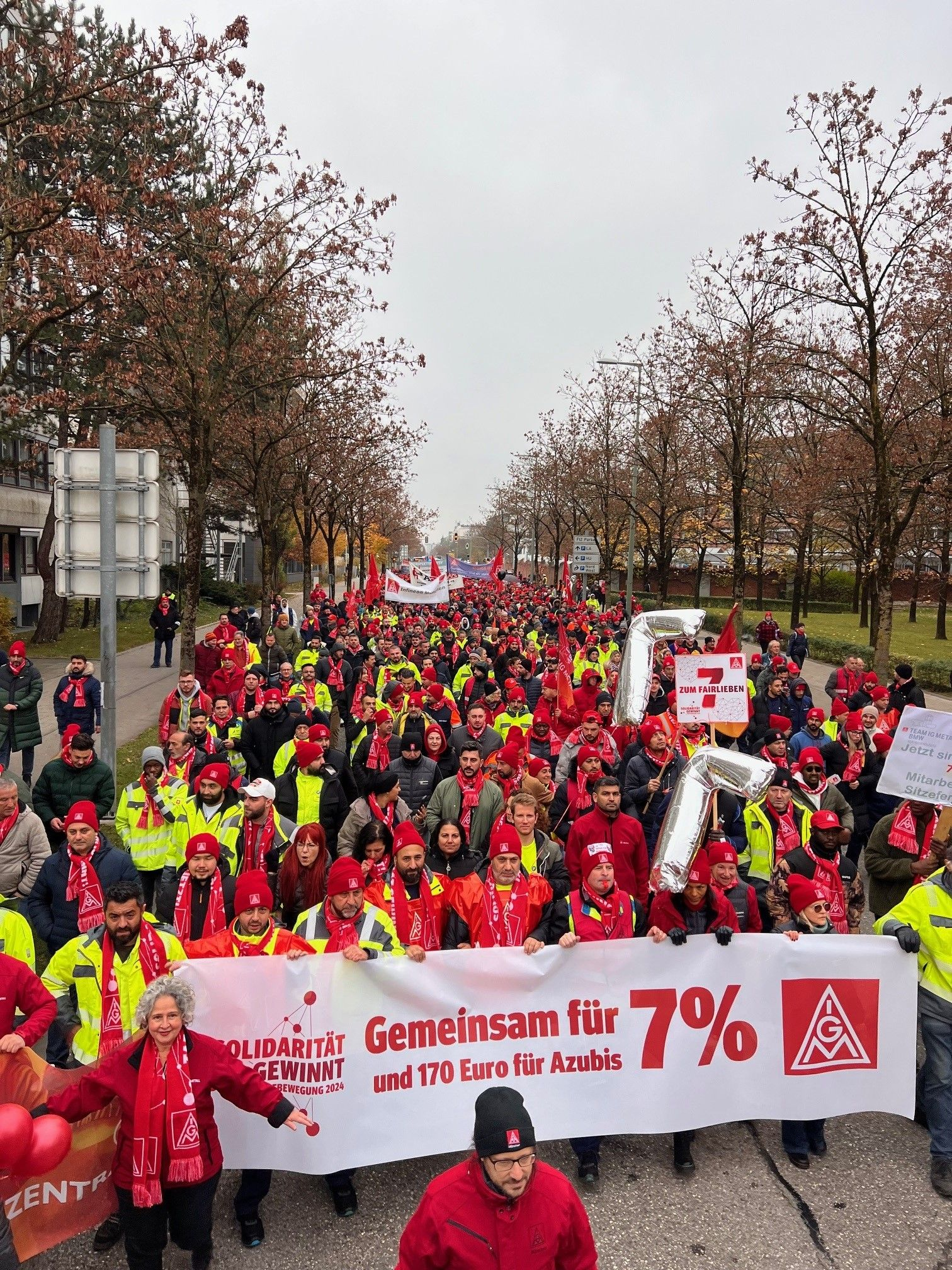 15.000 bei Großdemo bei Audi. Jeweils 9000 Warnstreikende in München und Schwaben. IG Metall-Bezirksleiter Horst Ott: „Wir nehmen diese Kraft und Energie der Menschen mit in die Verhandlungsrunde.“