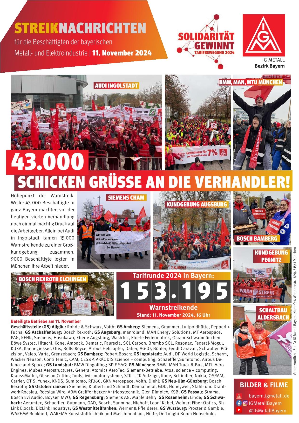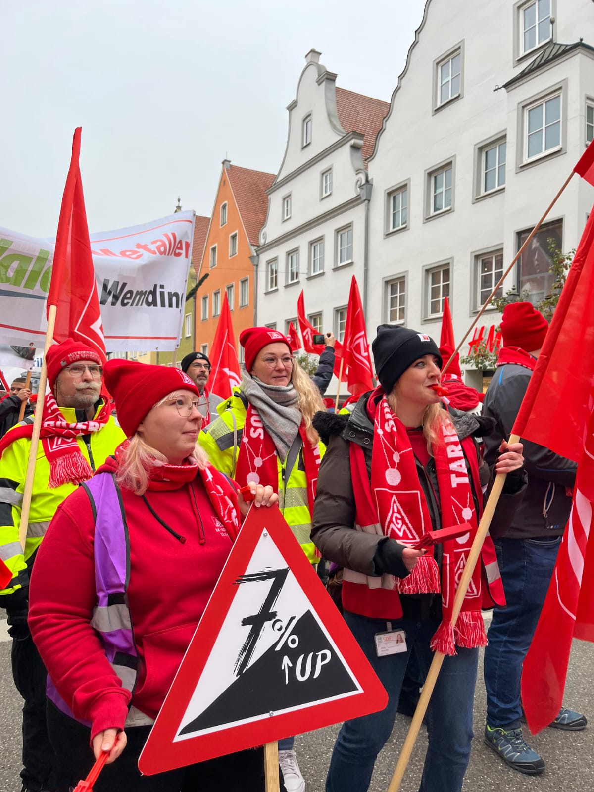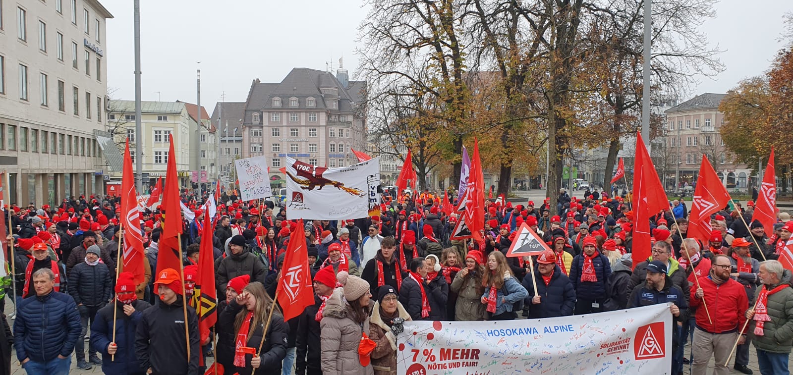 15.000 bei Großdemo bei Audi. Jeweils 9000 Warnstreikende in München und Schwaben. IG Metall-Bezirksleiter Horst Ott: „Wir nehmen diese Kraft und Energie der Menschen mit in die Verhandlungsrunde.“