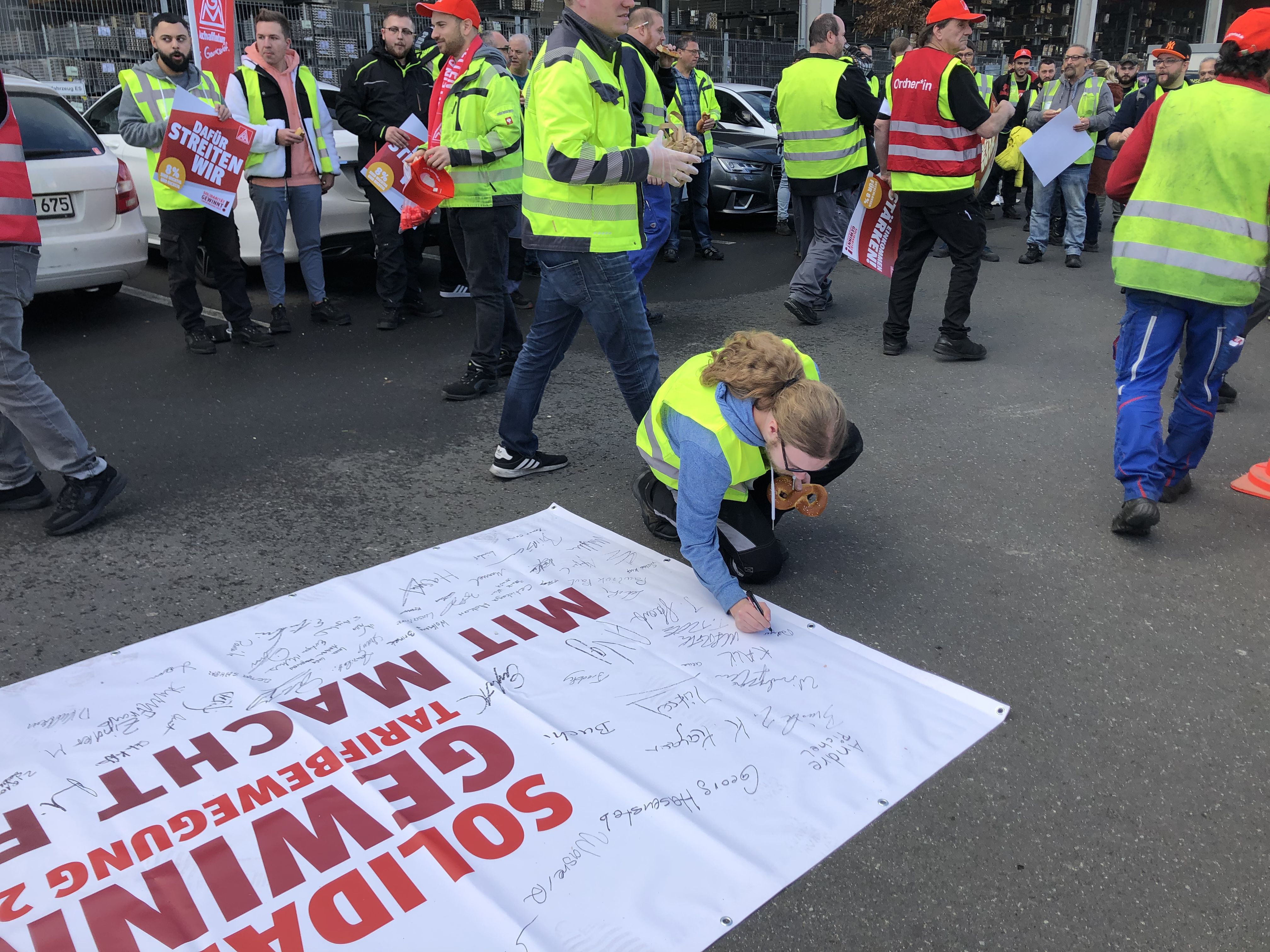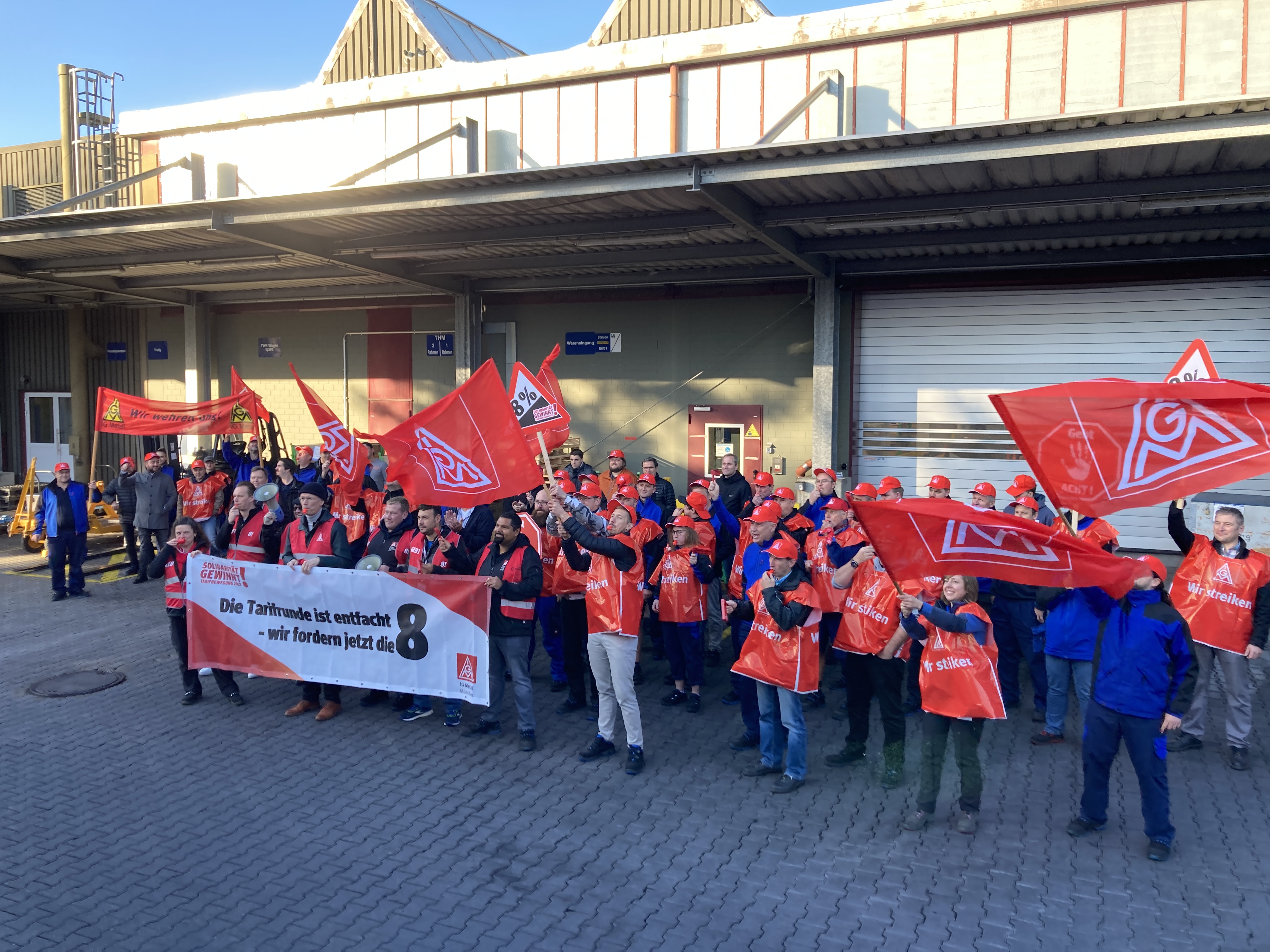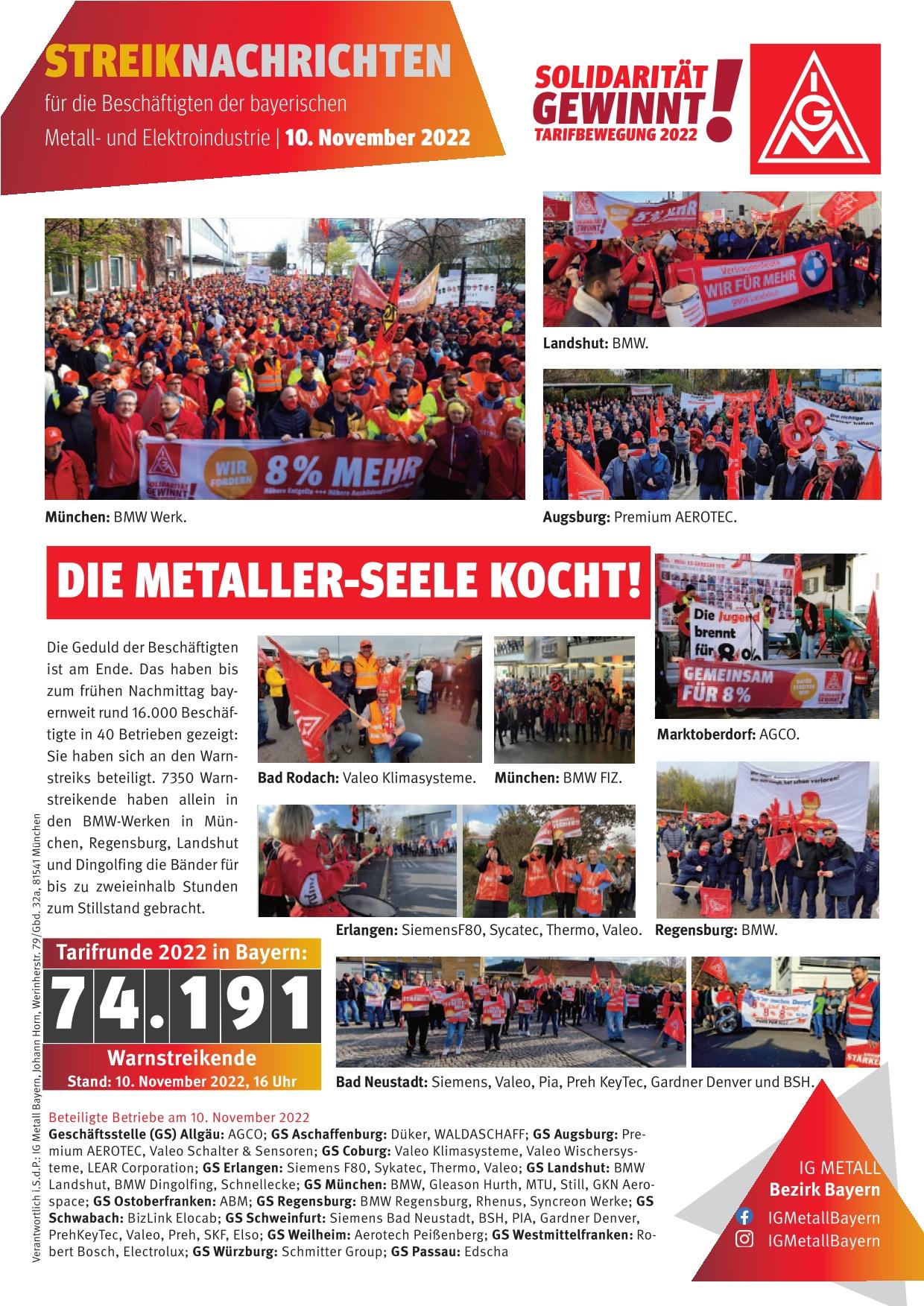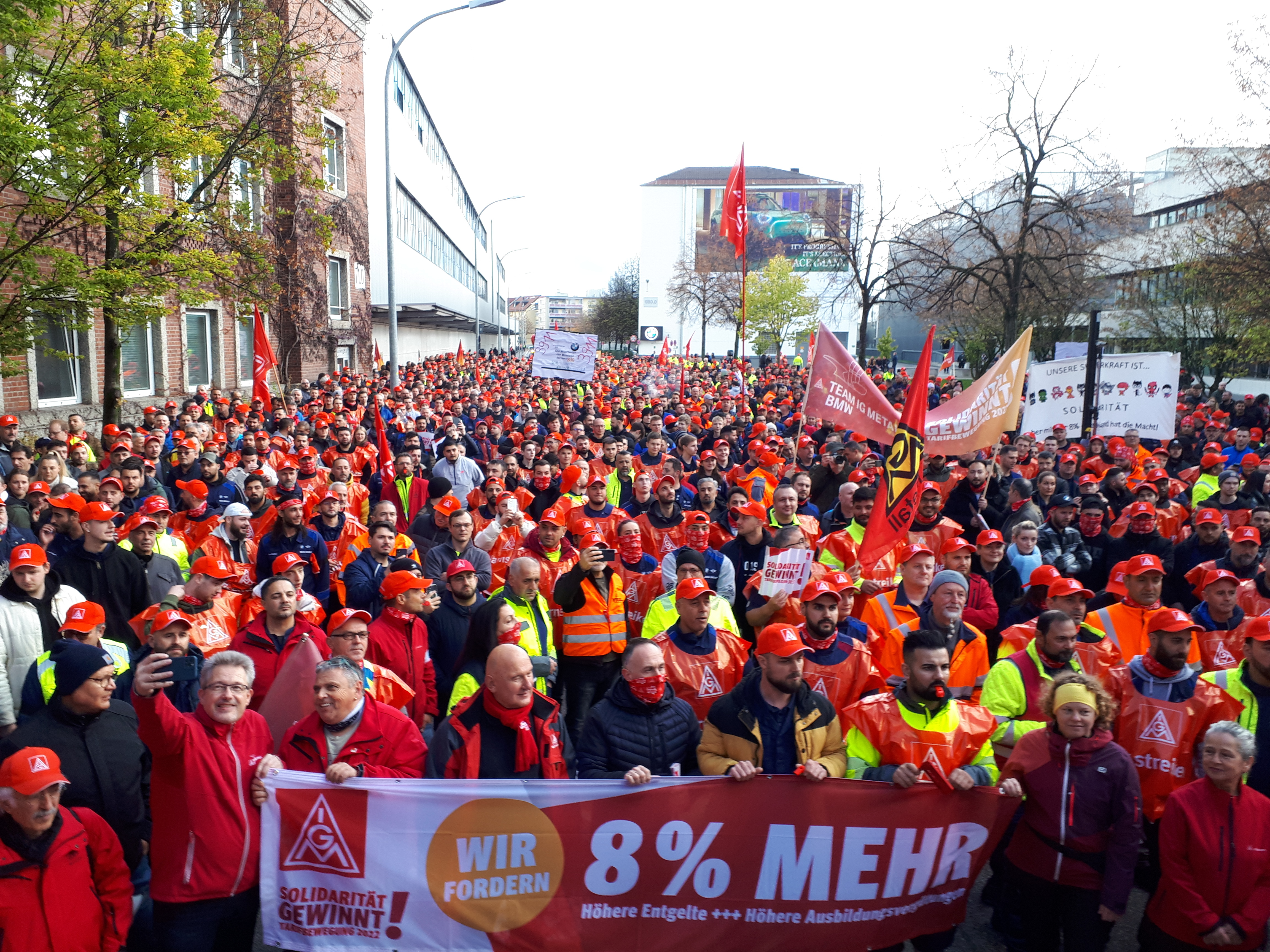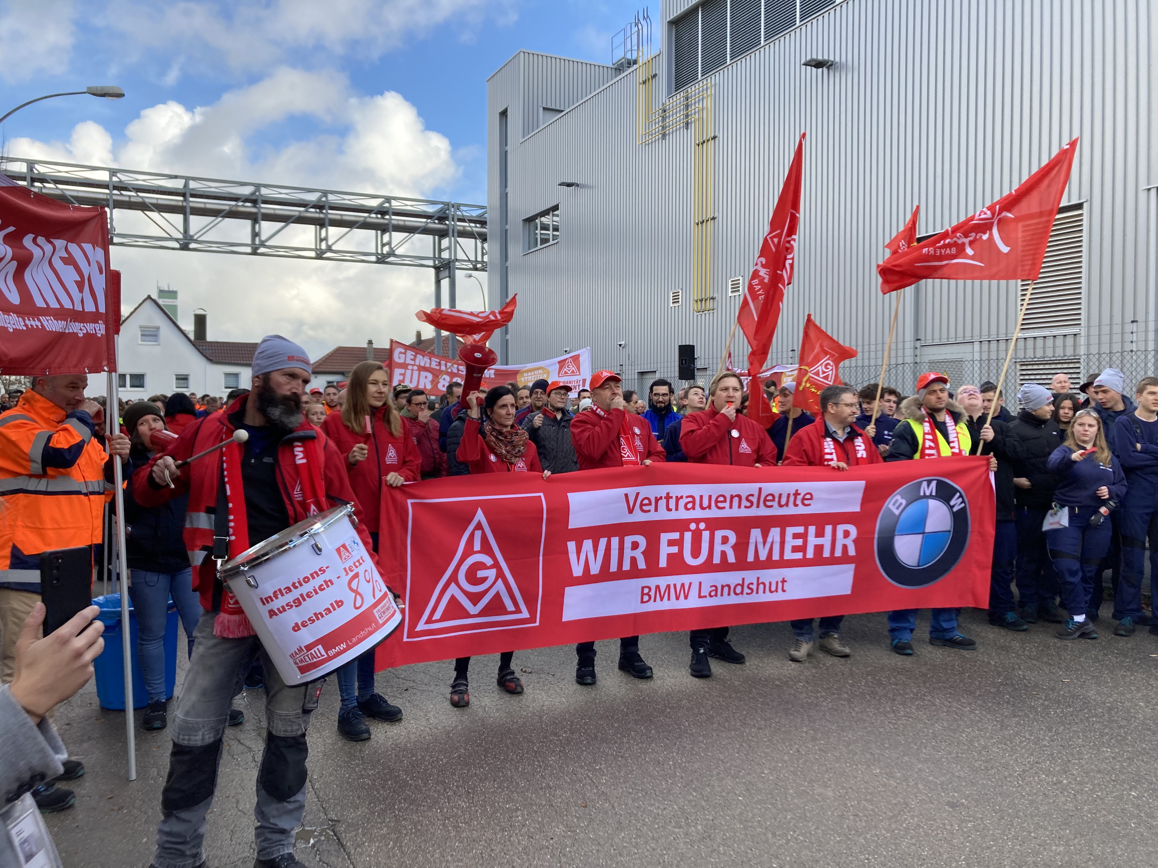 Am heutigen Donnerstag standen die BMW-Werke im Zentrum der Warnstreiks in der bayerischen Metall- und Elektroindustrie. Über 7350 Warnstreikende haben in den BMW-Werken in München, Regensburg, Landshut und Dingolfing die Bänder für bis zu zweieinhalb Stunden zum Stillstand gebracht. Beteiligt waren auch die Kontraktlogistiker Rhenus und Schnellecke in Regensburg beziehungsweise Landshut, die für An- und Auslieferung von Material und Produkten zuständig sind. Insgesamt haben sich heute bis zum frühen Nachmittag bayernweit rund 16.000 Beschäftigte in 40 Betrieben an den Warnstreiks beteiligt. Beim Flugzeugbauer Premium Aerotec in Augsburg legten 1450 Beschäftigte vorübergehend die Arbeit nieder, beim Landmaschinenbauer AGCO in Marktoberdorf 1100 Beschäftigte. An zeitgleichen Warnstreiks von sechs Betrieben im unterfränkischen Bad Neustadt beteiligten sich zusammen 1500 Beschäftigte. In mehreren Betrieben folgen heute noch Warnstreiks der Spätschichten.