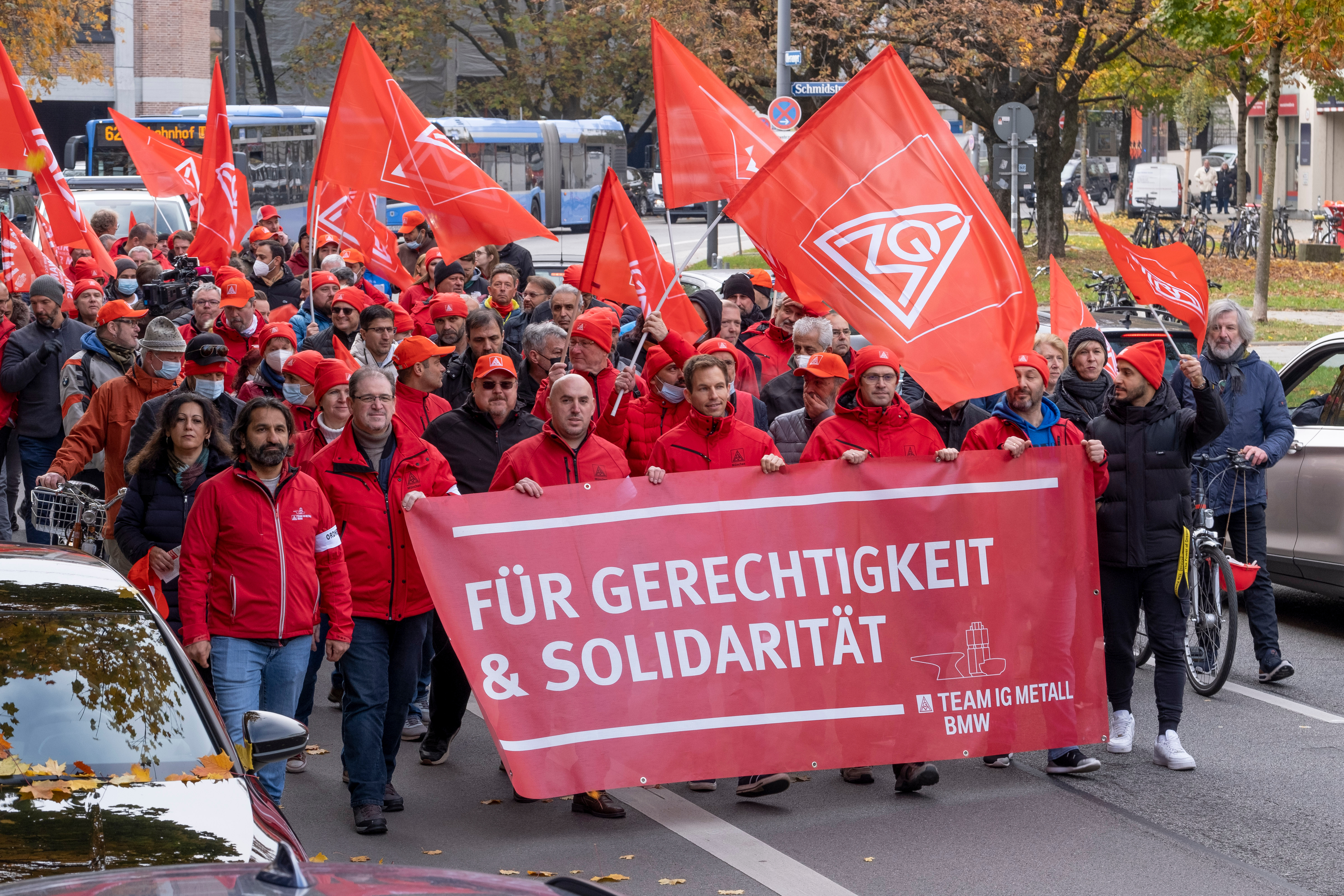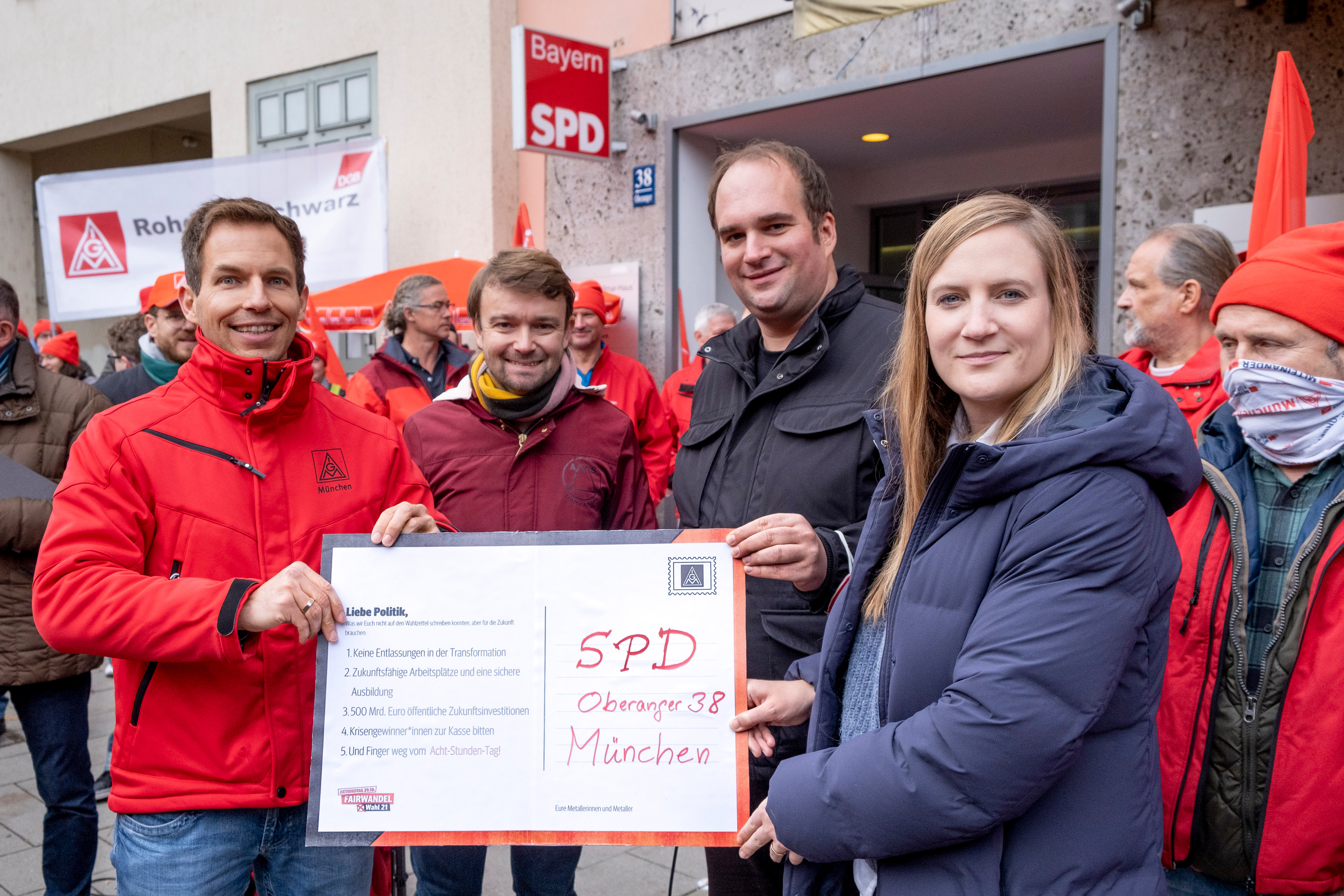 In München übergaben Vertreter*innen der IG Metall gemeinsam mit rund 1.100 Beschäftigten zunächst bei vier zeitgleichen Auftaktkundgebungen vor den bayerischen Parteizentralen von SPD, Bündnis 90/Die Grünen, FDP und CSU die Forderungen der Gewerkschaft. In vier Demozügen zu Fuß, mit dem Fahrrad und mit dem Auto zogen die Beschäftigten anschließend zur gemeinsamen Kundgebung auf dem Odeonsplatz, an der sich auch ein Redner des BUND Naturschutz beteiligte.