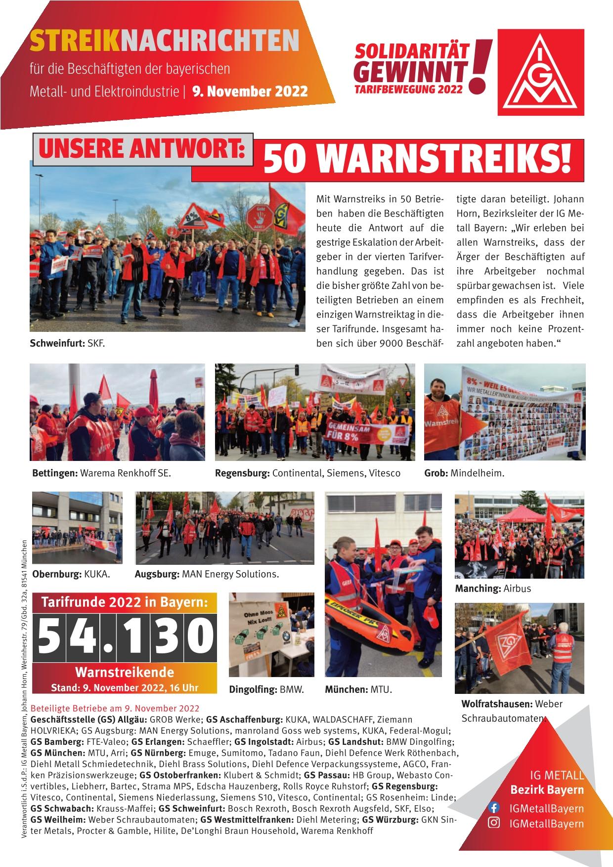Mit Warnstreiks in 50 Betrieben in ganz Bayern haben die IG Metall und die Beschäftigten heute die Antwort auf die gestrige Eskalation der Arbeitgeber in der vierten Tarifverhandlung gegeben. Das ist die bisher größte Zahl von beteiligten Betrieben an einem einzigen Warnstreiktag in dieser Tarifrunde für die Metall- und Elektroindustrie. Insgesamt haben sich über 9000 Beschäftigte daran beteiligt. Die größten Warnstreiks gab es bei SKF in Schweinfurt, MAN Energy Solutions in Augsburg, Airbus in Manching, MTU in München und Grob in Mindelheim. Bei BMW in Dingolfing hat die Nachtschicht für eine Stunde die Arbeit niedergelegt. Erstmals überhaupt haben die Beschäftigten heute den Standort Bettingen des Unternehmens Warema Renkhoff der vbm-Verhandlungsführerin bestreikt. 200 Beschäftigte haben sich dort beteiligt, die Bänder standen zeitweise still.