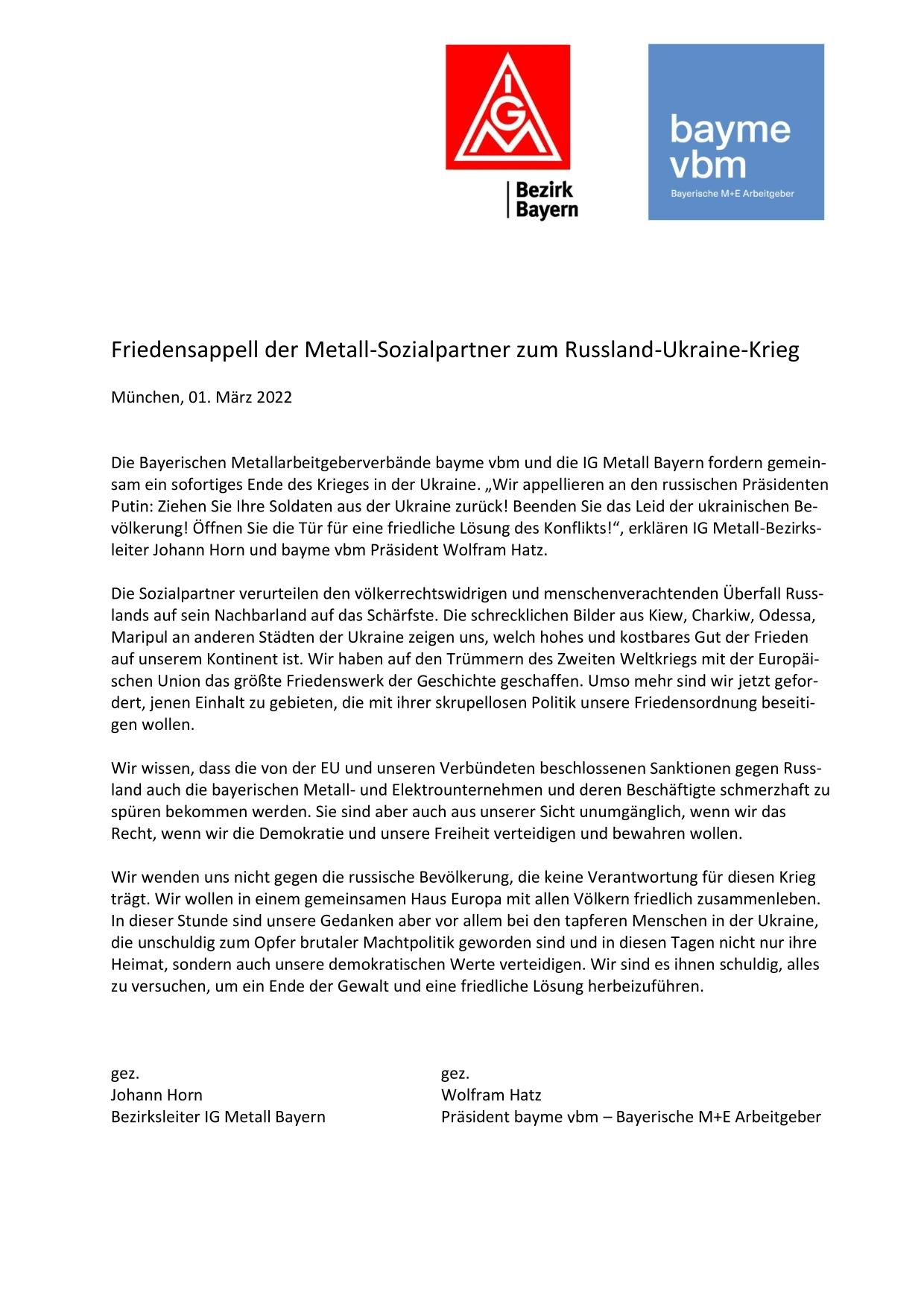 Die Bayerischen Metallarbeitgeberverbände bayme vbm und die IG Metall Bayern fordern gemeinsam ein sofortiges Ende des Krieges in der Ukraine. „Wir appellieren an den russischen Präsidenten Putin: Ziehen Sie Ihre Soldaten aus der Ukraine zurück! Beenden Sie das Leid der ukrainischen Bevölkerung! Öffnen Sie die Tür für eine friedliche Lösung des Konflikts!“, erklären IG Metall-Bezirksleiter Johann Horn und bayme vbm Präsident Wolfram Hatz.