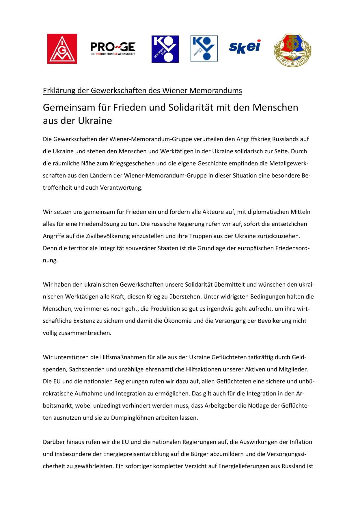Die Gewerkschaften der Wiener-Memorandum-Gruppe verurteilen den Angriffskrieg Russlands auf die Ukraine und stehen den Menschen und Werktätigen in der Ukraine solidarisch zur Seite. Durch die räumliche Nähe zum Kriegsgeschehen und die eigene Geschichte empfinden die Metallgewerkschaften aus den Ländern der Wiener-Memorandum-Gruppe in dieser Situation eine besondere Betroffenheit und auch Verantwortung.