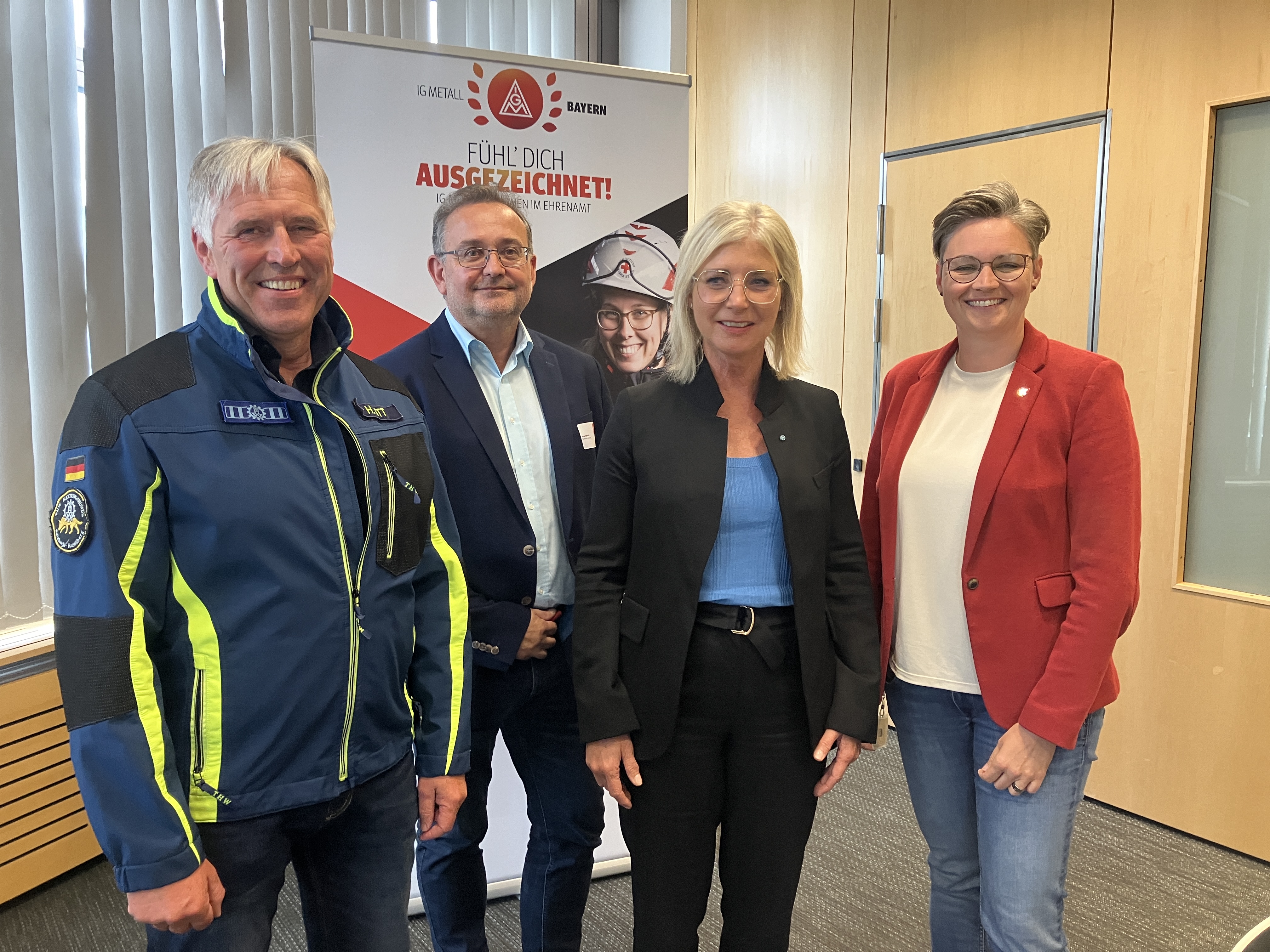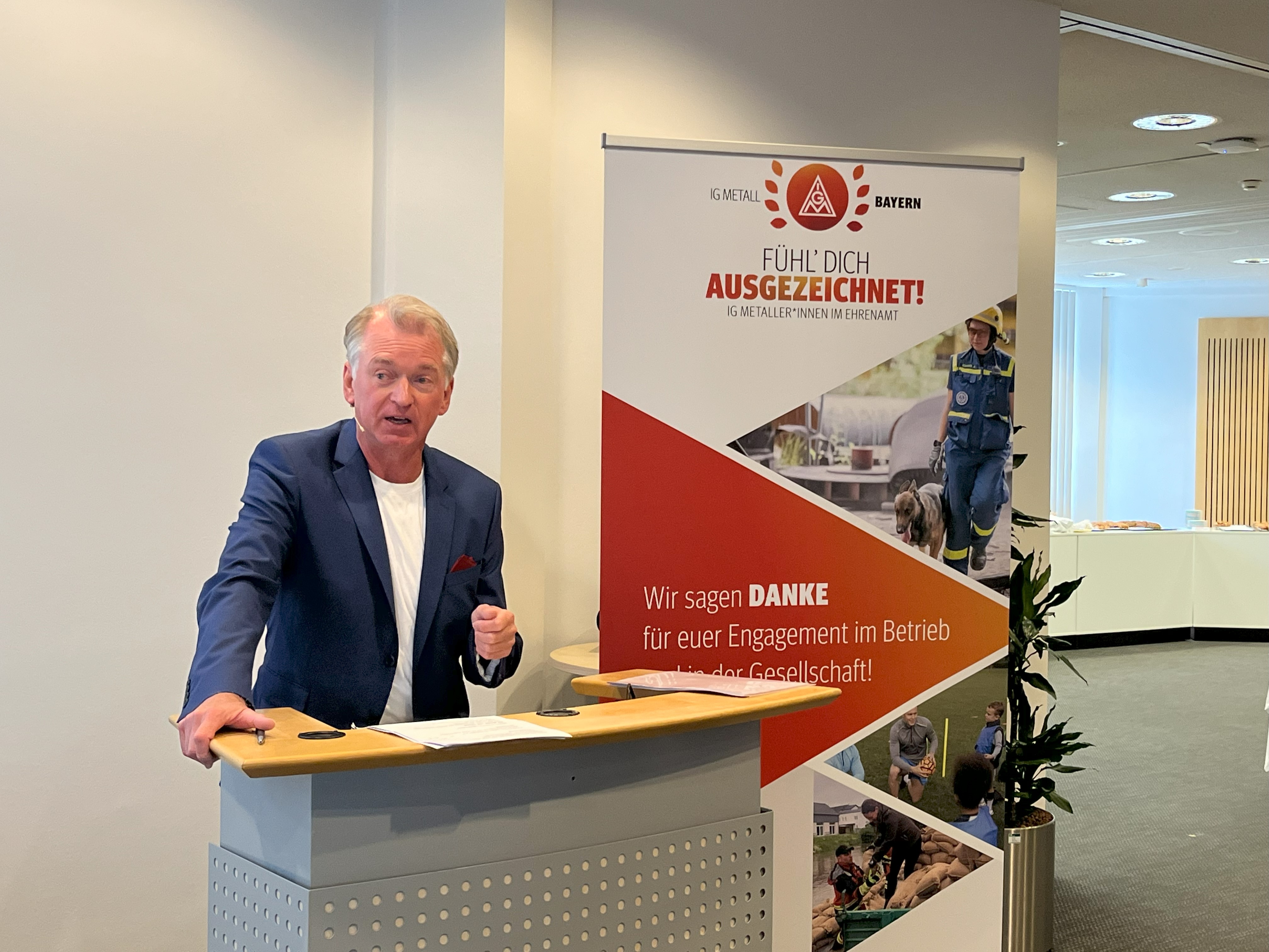 Horst Ott betonte die Bedeutung des Ehrenamts für den gesellschaftlichen Zusammenhalt: „Unsere Demokratie funktioniert nur, weil sich Menschen ehrenamtlich für andere engagieren. Für die IG Metall sind in den bayerischen Betrieben 20 000 Vertrauensleute aktiv, von denen sich sehr viele auch darüber hinaus in Feuerwehren, bei Rettungsdiensten, im THW sowie in unzähligen sozialen und sportlichen Vereinen und Initiativen einsetzen. Diese Menschen bilden mit ihrem Engagement die Grundlage unserer Gesellschaft. Die IG Metall will dieses ehrenamtliche Engagement unterstützen und besonders hervorheben. Dafür machen wir unsere Ehrenamtlichen mit der heutigen Veranstaltung sichtbar und werfen einen Blick unter anderem auf die Themen Weiterbildung und Rahmenbedingungen fürs Ehrenamt. Dazu gibt es einige rechtliche Rahmenbedingungen und Möglichkeiten. Wir wollen mit den Menschen darüber reden, ob alle Möglichkeiten für Ehrenamtliche bekannt und noch zeitgemäß sind. Ich würde mich freuen, wenn wir mit der Politik ins Gespräch kommen, wie wir die Weiterbildungsmöglichkeiten für Ehrenamtliche noch verbessern können.“