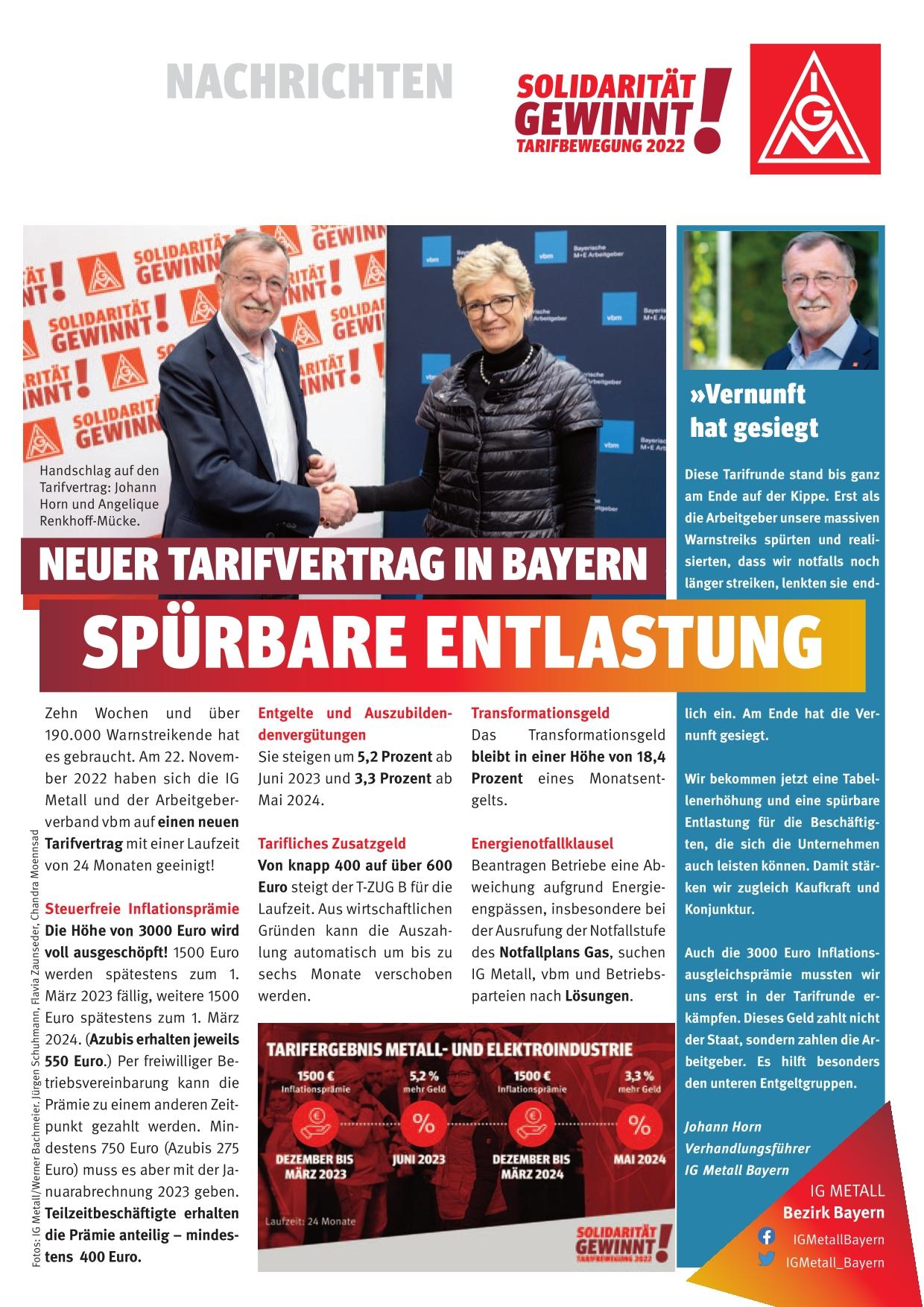 „Mit diesem Abschluss hat die IG Metall eine spürbare Entlastung für die Beschäftigten erreicht. Das ist nur mit der massiven Unterstützung der rund 190.000 Warnstreikenden in Bayern gelungen. Mit dem Paket aus prozentualen Entgeltsteigerungen und steuerfreien Inflationsausgleichsprämien stärken wir die Kaufkraft der Beschäftigten dauerhaft und unterstützen sie bei der Finanzierung der gestiegenen Lebenshaltungskosten. Das hilft den Menschen, und es stützt auch die Konjunktur. Von den Inflationsausgleichsprämien profitieren die Beschäftigten in den unteren Entgeltgruppen überproportional, auch das war der IG Metall ein wichtiges Anliegen in dieser Tarifrunde. Dabei ist wichtig zu betonen, dass die insgesamt 3000 Euro steuer- und abgabenfreie Inflationsausgleichsprämie auch Teil des Tarifvertrages sind. Dieses Geld zahlt nicht der Staat, sondern die Arbeitgeber. Auch den Auszubildenden hilft dieser Tarifabschluss, die gestiegenen Lebenshaltungskosten zu schultern. Sie erhalten eine Inflationsausgleichsprämie von zweimal 550 Euro, was jeweils in etwa einer halben monatlichen Auszubildendenvergütung entspricht. Wir können mit diesem Tarifabschluss die enorme Inflation nicht vollständig ausgleichen. Doch zusammen mit den Entlastungen für die Bürger durch die Bundesregierung, für die sich die IG Metall ebenfalls intensiv eingesetzt hat, hilft dieser Tarifabschluss den Beschäftigten sehr, durch diese schwierige Zeit zu kommen.“