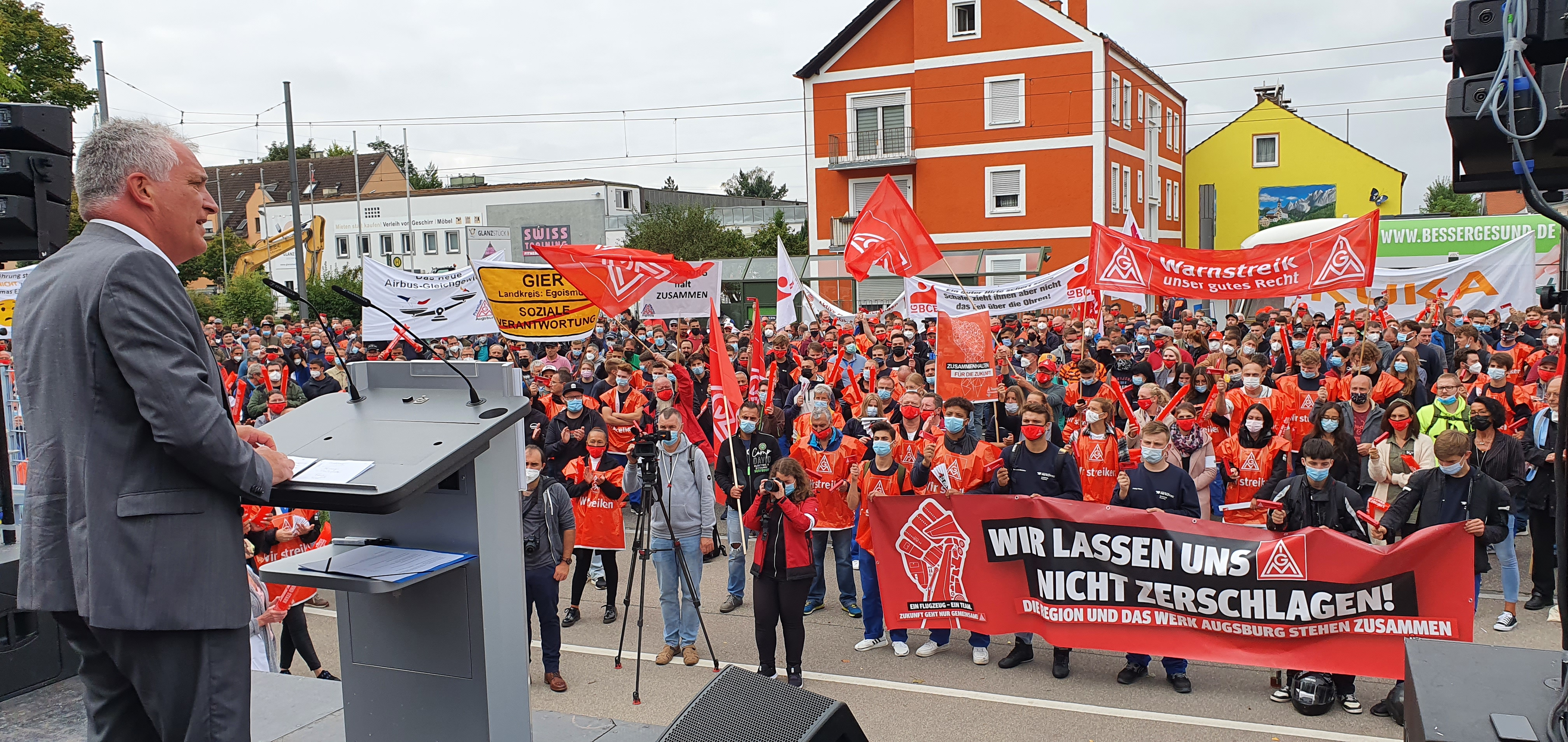 Jürgen Kerner, geschäftsführendes Vorstandsmitglied der IG Metall, sagte auf der Kundgebung bei Premium AEROTEC in Augsburg vor etwa 1.500 Beschäftigten: „Wir haben von Anfang an klargemacht: Schlanke und effiziente Strukturen in der Wertschöpfungskette gestalten wir gerne mit, gegen eine Zerschlagung von Standorten bei Airbus und Premium AEROTEC werden wir aber Widerstand organisieren. Die Arbeitgeberseite hat unsere ausgestreckte Hand ausgeschlagen. Wenn die Auseinandersetzung um die Zukunft von Airbus nun eskaliert, liegt das allein in der Verantwortung des Managements.“
