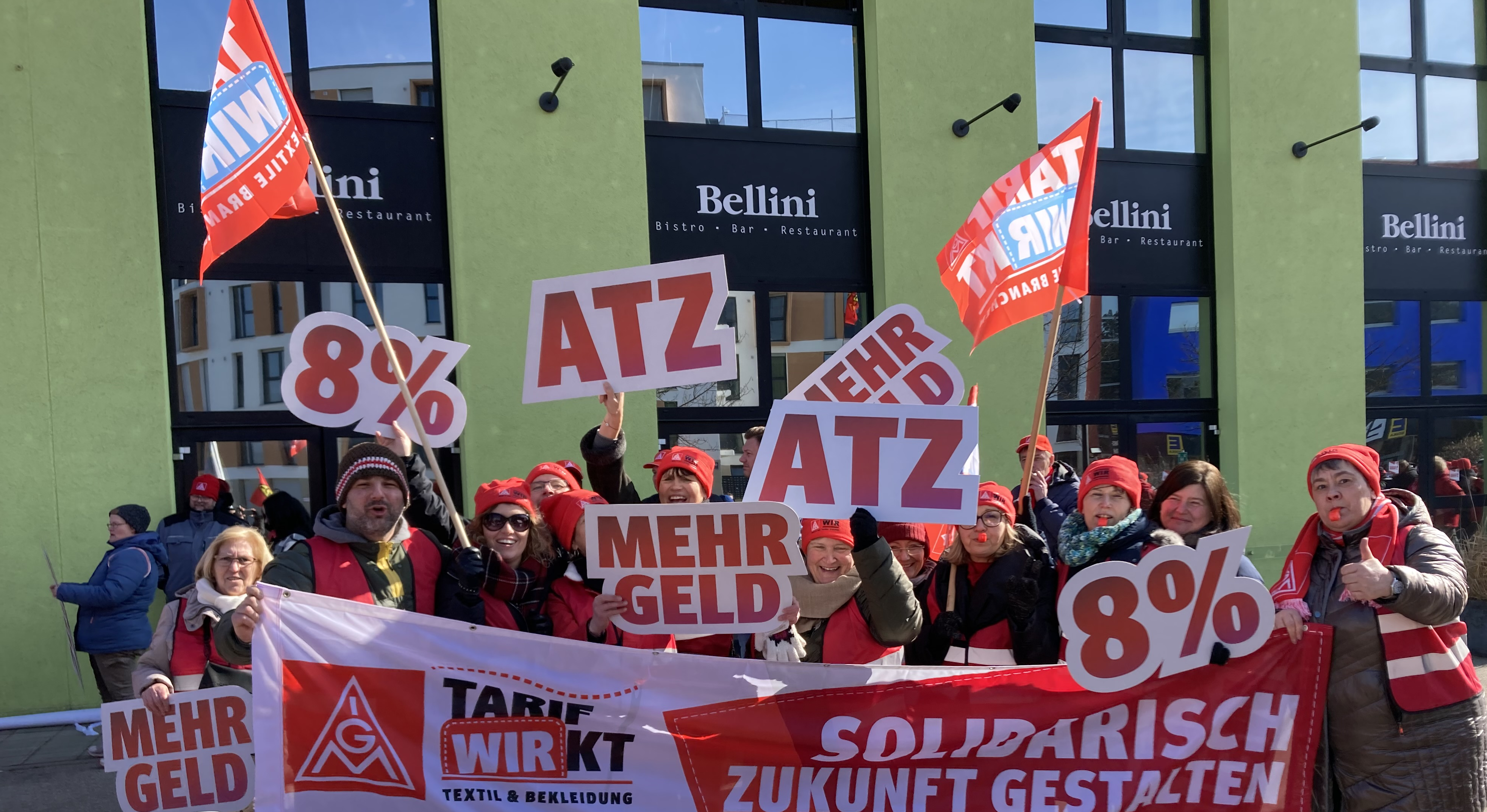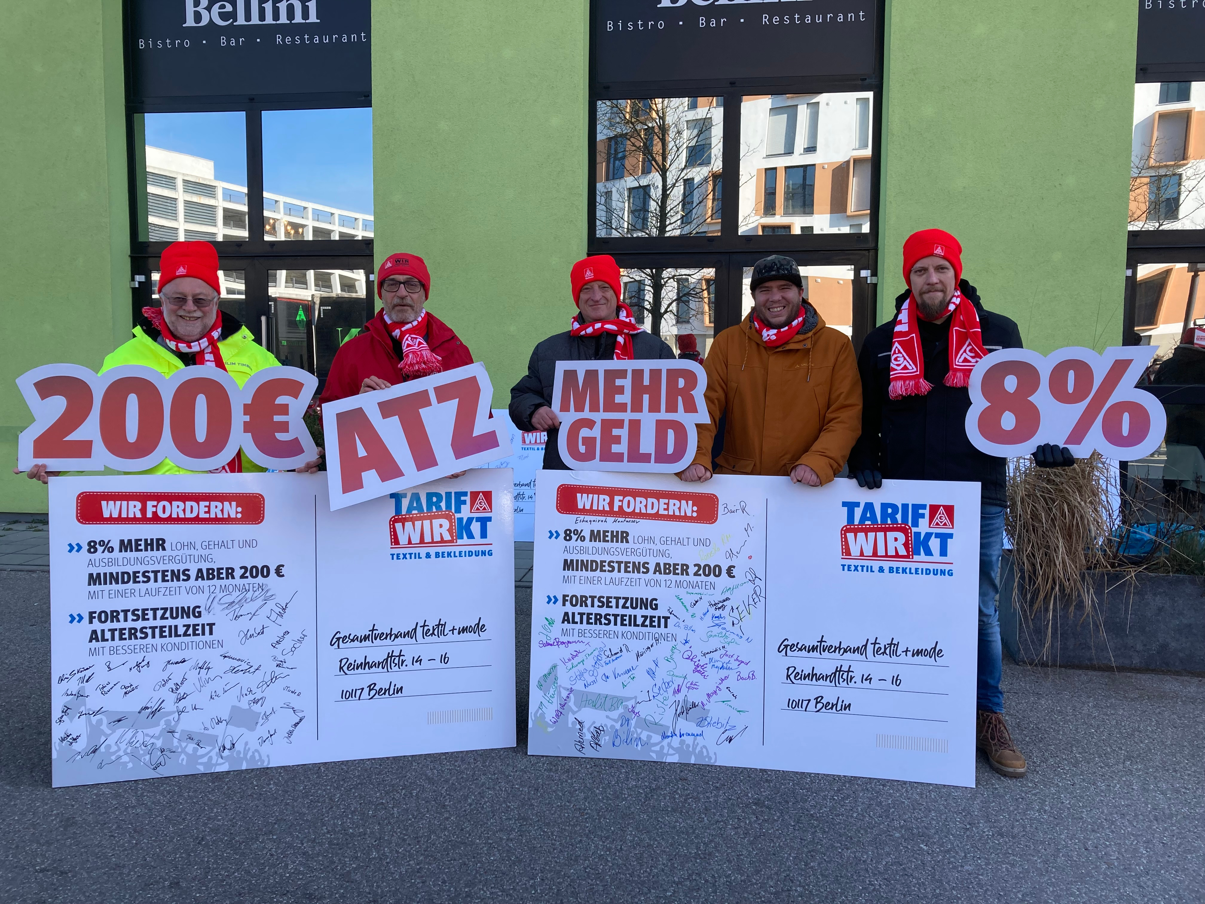 Die IG Metall fordert für die rund 100.000 Beschäftigten der Textil- und Bekleidungsindustrie 8 Prozent mehr Geld, mindestens aber 200 Euro mehr für eine Laufzeit von 12 Monaten. Außerdem soll die Altersteilzeit zu verbesserten Konditionen fortgesetzt werden. Die Arbeitgeber wiesen die Forderung als völlig überzogen zurück. Sie bieten neben einer Inflationsausgleichsprämie von insgesamt 1500 Euro nur eine minimale Erhöhung der Tabellen um 3,25 Prozent ab November 2023 und 2,25 Prozent ab Oktober 2024 für eine Laufzeit von 27 Monaten an. Die Altersteilzeit wollen sie gleich ganz streichen. Die IG Metall-Tarifkommission hat dieses Angebot abgelehnt.