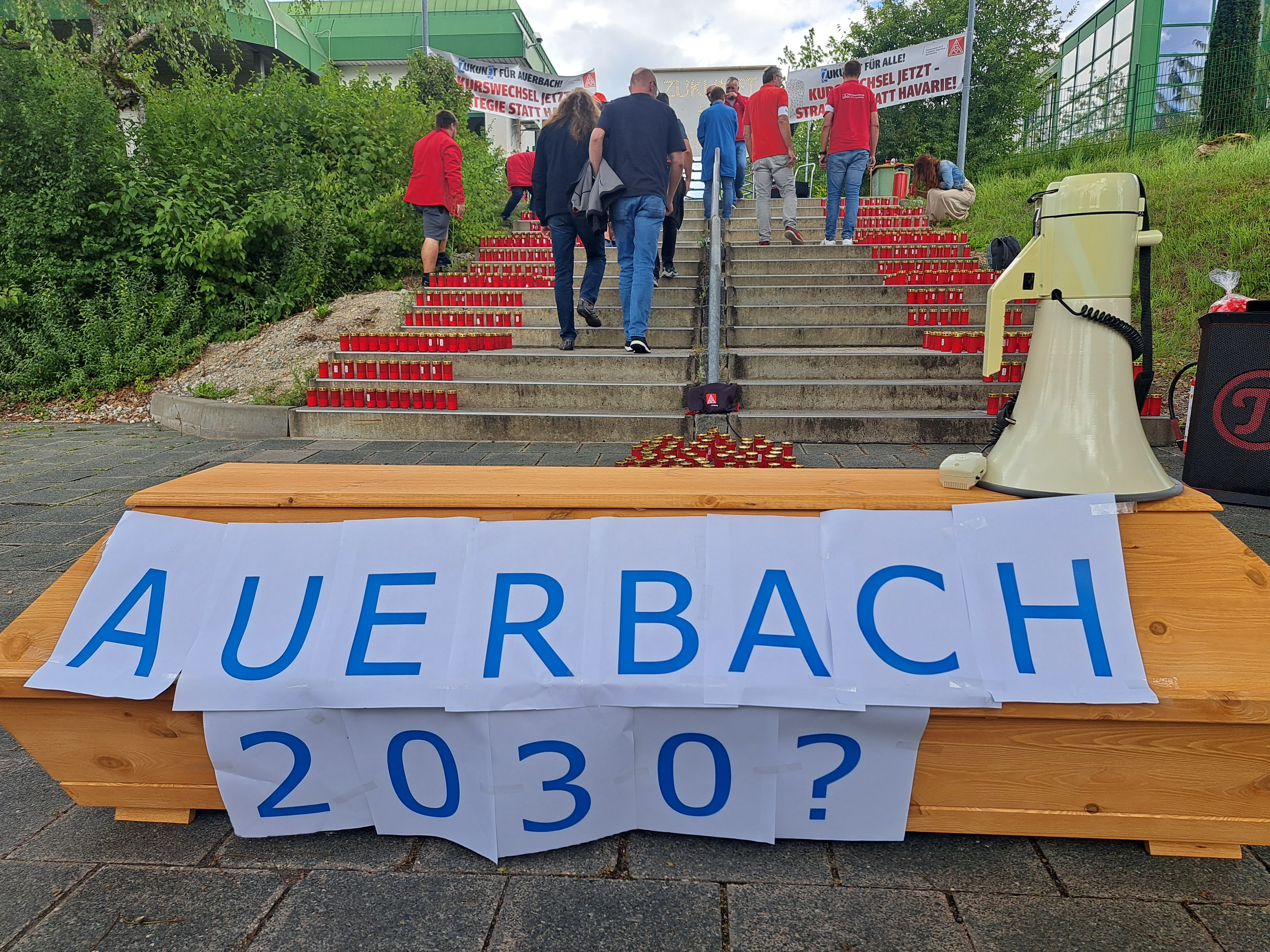 Protest mit Wirkung: 6500 ZFBeschäftigte demonstrierten Ende Juli in Schweinfurt, Auerbach, Thyrnau, Nürnberg und Bayreuth für ihre Zukunft. Und anders als geplant traf der ZF-Aufsichtsrat keine Entscheidung gegen die Zukunft der Division E. Division E ist Herzstück von ZF. Noch sind die Kahlschlagpläne nicht vom Tisch. Das Unternehmen hat nun bis zum 30. September Zeit, mit der IG Metall und den Betriebsräten einen gemeinsamen Weg zu finden. Die Division E ist das Herzstück des Autozulieferers und beinhaltet die komplette Antriebstechnologie für E-Mobilität, Hybrid- und Verbrennungsmotoren. Allein in Bayern arbeiten in der Division E rund 9000 Beschäftigte und damit etwa die Hälfte aller ZF-Beschäftigten in Bayern. Die Antriebssparte muss erhalten bleiben.